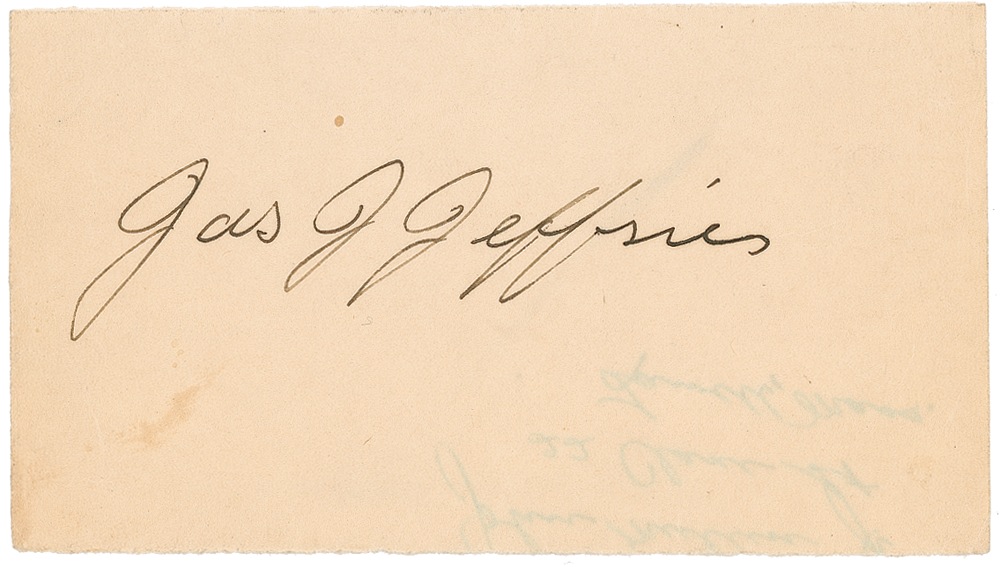 Vintage fountain pen signature, “Jas. J. Jeffries,” on an off-white 5.5 x 3 slip. In fine condition, with creasing to lower left corner, and a few tiny spots of soiling and toning. Pre-certified Steve Grad/PSA/DNA and RRAuction COA.