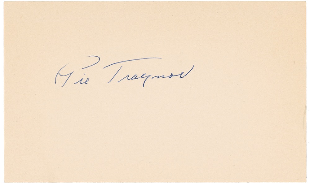 Traynor was a superior third baseman and a skillful hitter. He batted .320 during his 17-year career and never struck out more than 28 times in a season. Exceptional vintage ballpoint signature, “Pie Traynor,” on an off-white 5 x 3 card. In very fine condition. Pre-certified Steve Grad/PSA/DNA and RRAuction COA.