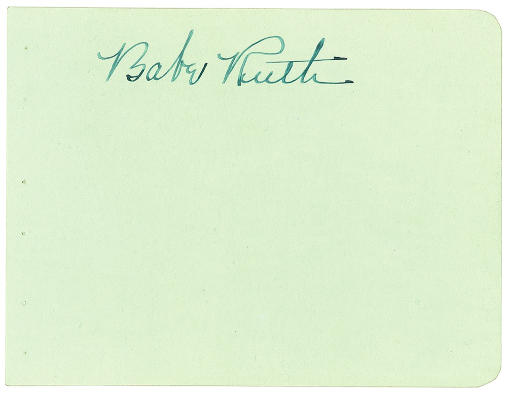 Absolutely amazing and pristine vintage fountain pen signature, “Babe Ruth,” on a light green 6 x 4.5 album page. In very fine condition, with binding holes along left edge. They really don’t come any better than this! Pre-certified Steve Grad/PSA/DNA and RRAuction COA.