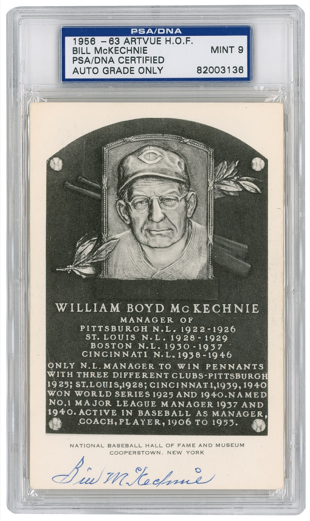 Longtime baseball manager who, with 1892 wins, ranks eleventh on the all-time list; he was inducted into the Hall of Fame in 1962. Black and white Hall of Fame plaque card signed along the bottom in blue ballpoint. Encapsulated in a plastic PSA/DNA authentication holder, grading the autograph “Mint 9.” In very fine condition. Pre-certified Steve Grad/PSA/DNA and RRAuction COA.