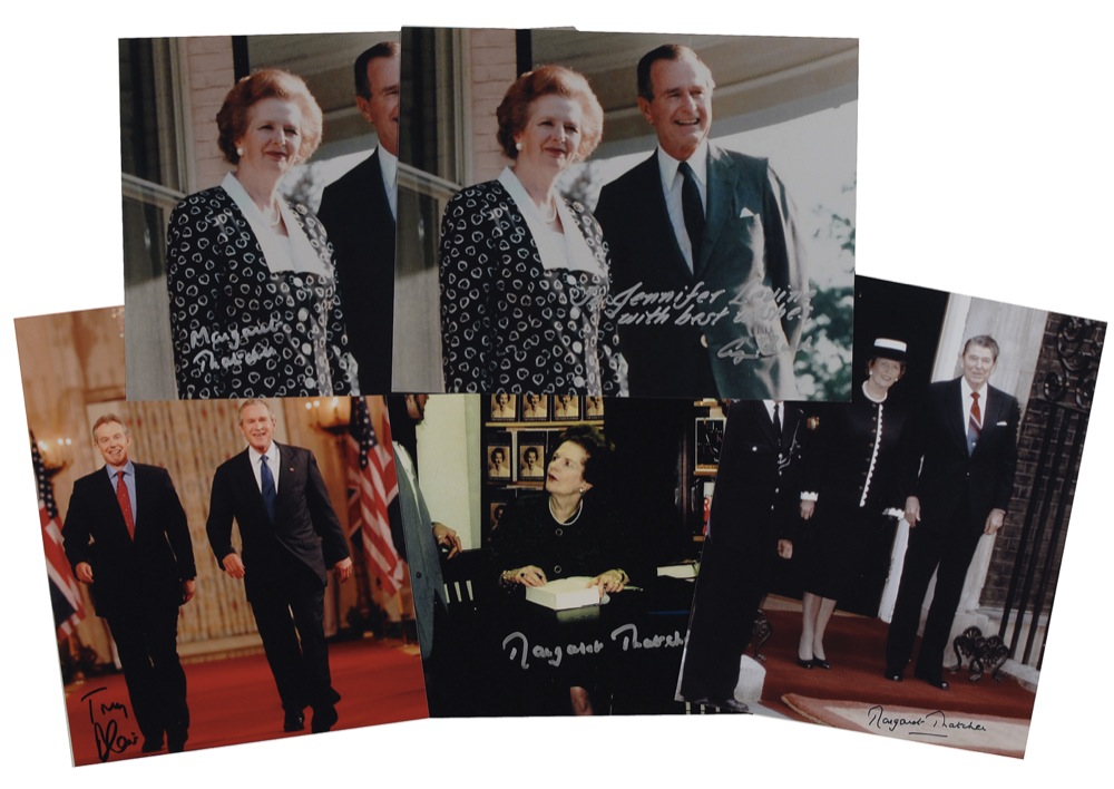 Five glossy and satin-finish 8 x 10 and 10 x 8 photos, each signed in ink or felt tip by one of the respective individuals pictured: Margaret Thatcher (3), Tony Blair, and George Bush, Sr. (inscribed to Jennifer). Some creasing to Bush’s photo, otherwise in overall fine condition. RRAuction COA.
