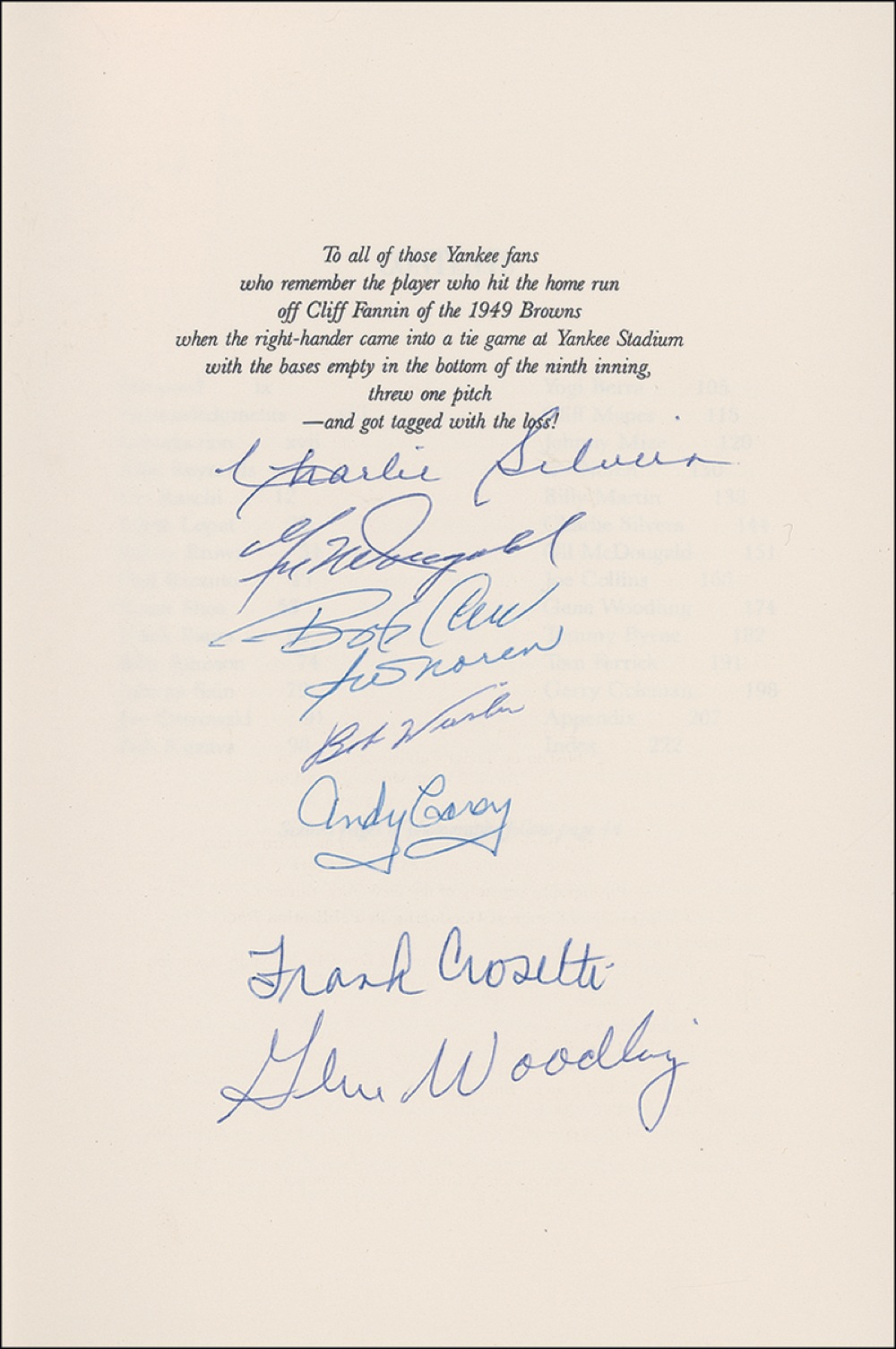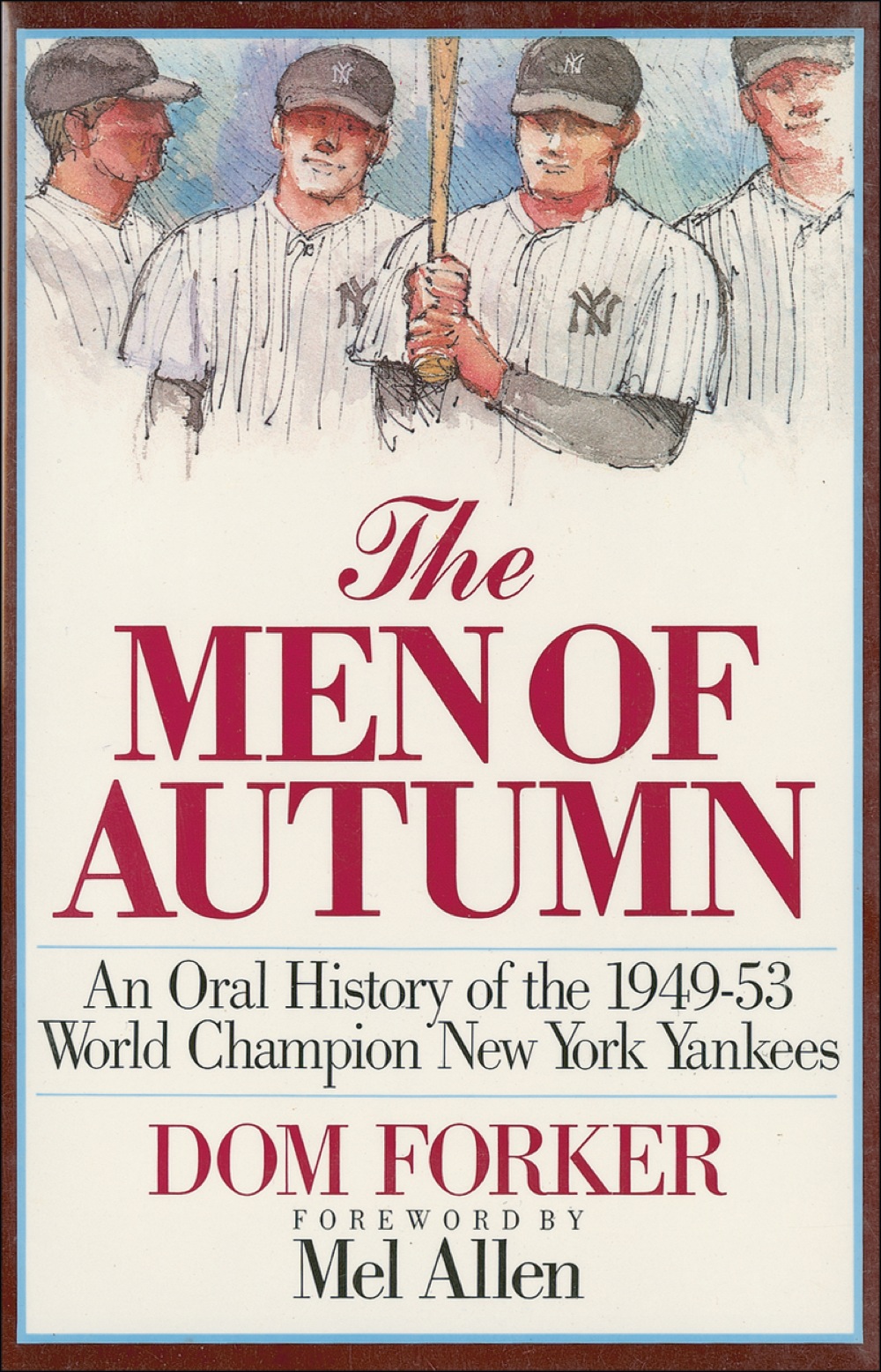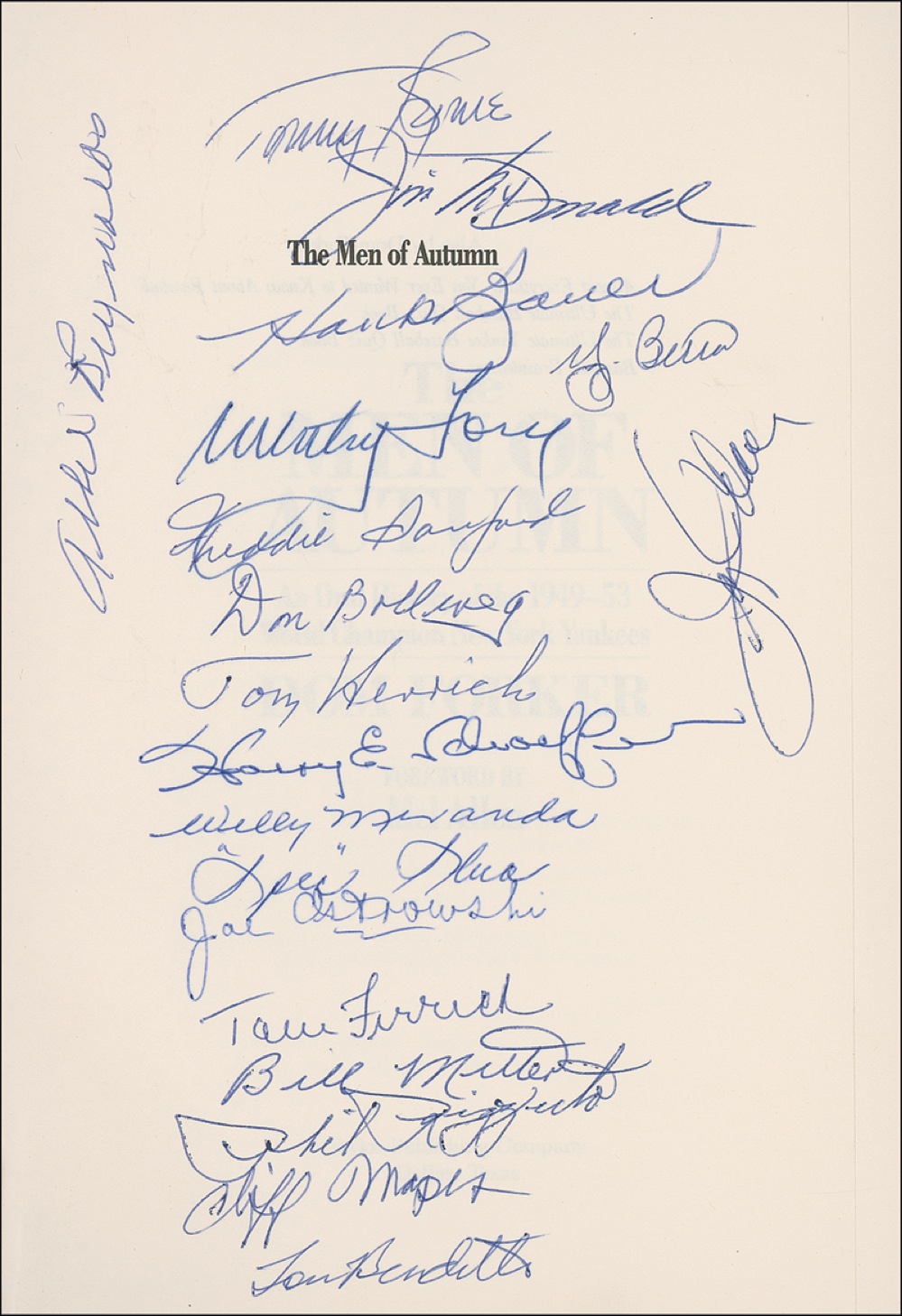 Signed book: The Men of Autumn. First edition, first printing. Dallas: Taylor Publishing, 1989. Hardcover with dustjacket, 6.5 x 9.5, 228 pages. Signed in ballpoint on the first free end and dedication pages by 27 former Yankees, including: Whitey Ford, Yogi Berra, Hank Bauer, Allie Reynolds, Tom Henrich, Phil Rizzuto, Gil McDougald, Frank Crosetti, and Gene Woodling. In fine condition. Pre-certified Steve Grad/PSA/DNA and RRAuction COA.