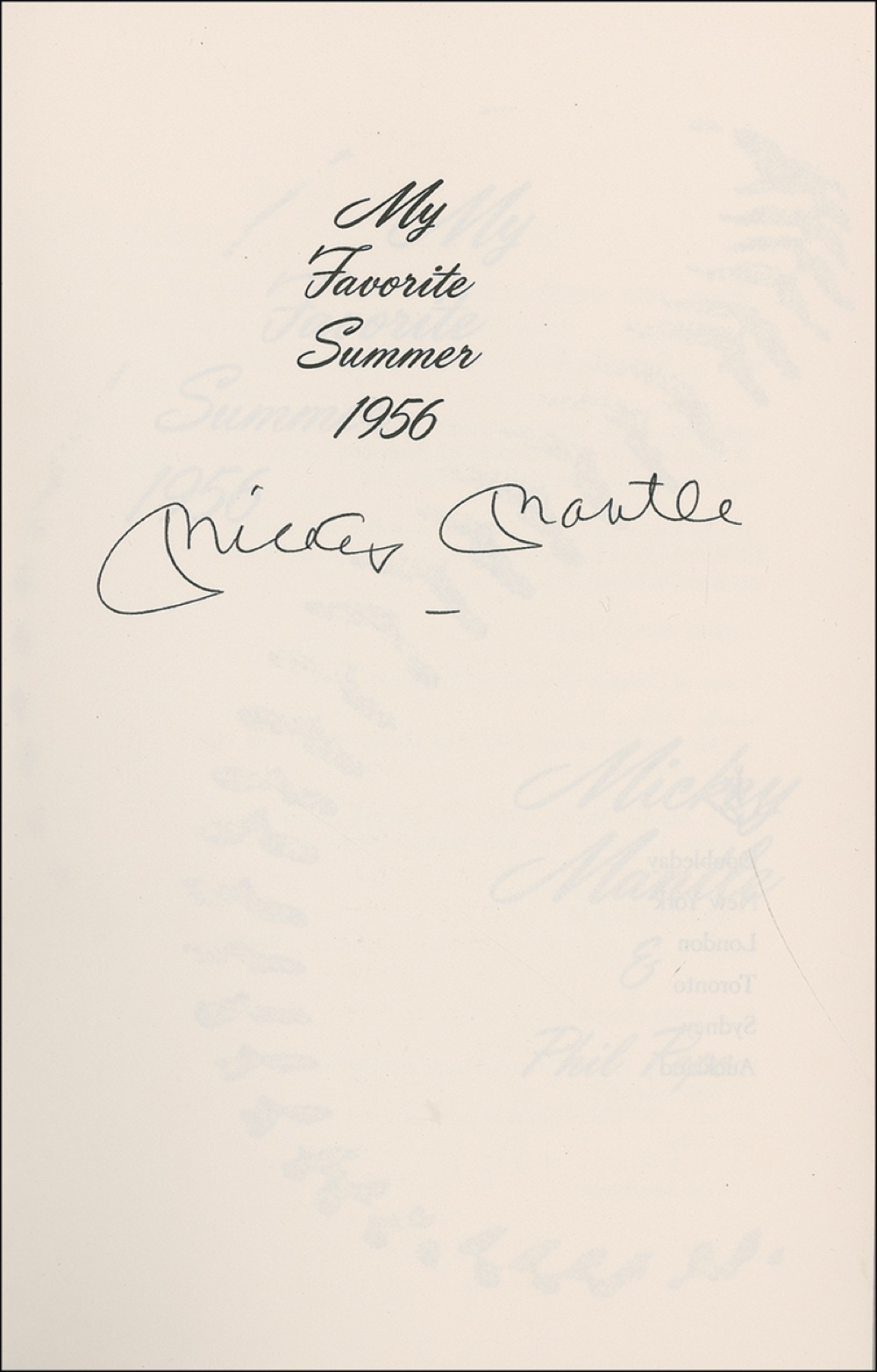 Signed book: My Favorite Summer 1956. First edition, first printing. NY: Doubleday, 1991. Hardcover with dustjacket, 6.5 x 9.5, 246 pages. Signed in black ink on the half-title page. In fine condition. Pre-certified Steve Grad/PSA/DNA and RRAuction COA.