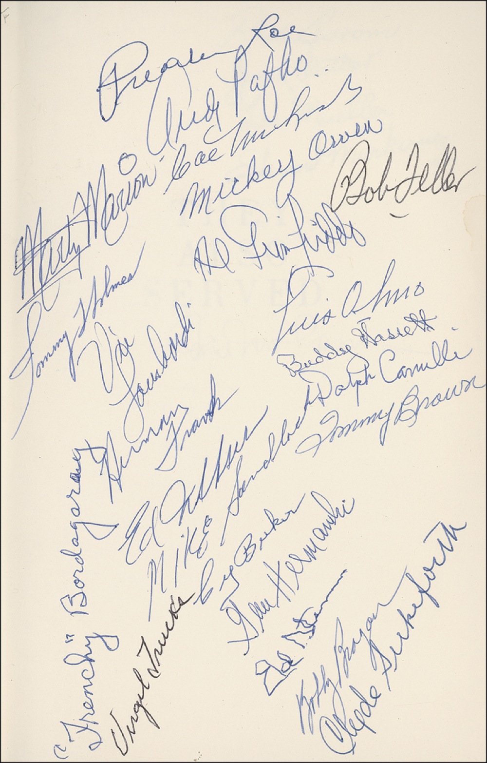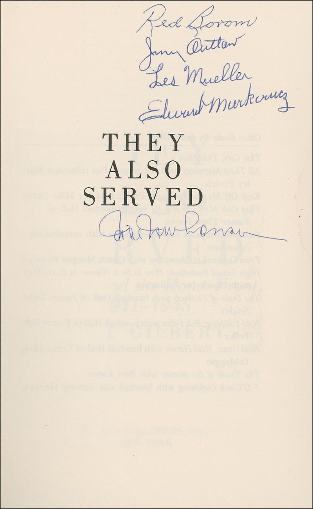 Signed book: They Also Served. First edition, first printing. NY: Crown Publishers, 1992. Hardcover with dustjacket, 6.25 x 9.25, 276 pages. Signed in ballpoint on the first free end page by 23 players who also served in the military, including: Preacher Roe, Andy Pafko, Mickey Owens, Tommy Holmes, Bob Feller, Tommy Brown, Dolph Camilli, Buddy Hassett, Virgil Trucks, and ‘Frenchy’ Bordagaray. In fine condition. Pre-certified Steve Grad/PSA/DNA and RRAuction COA.