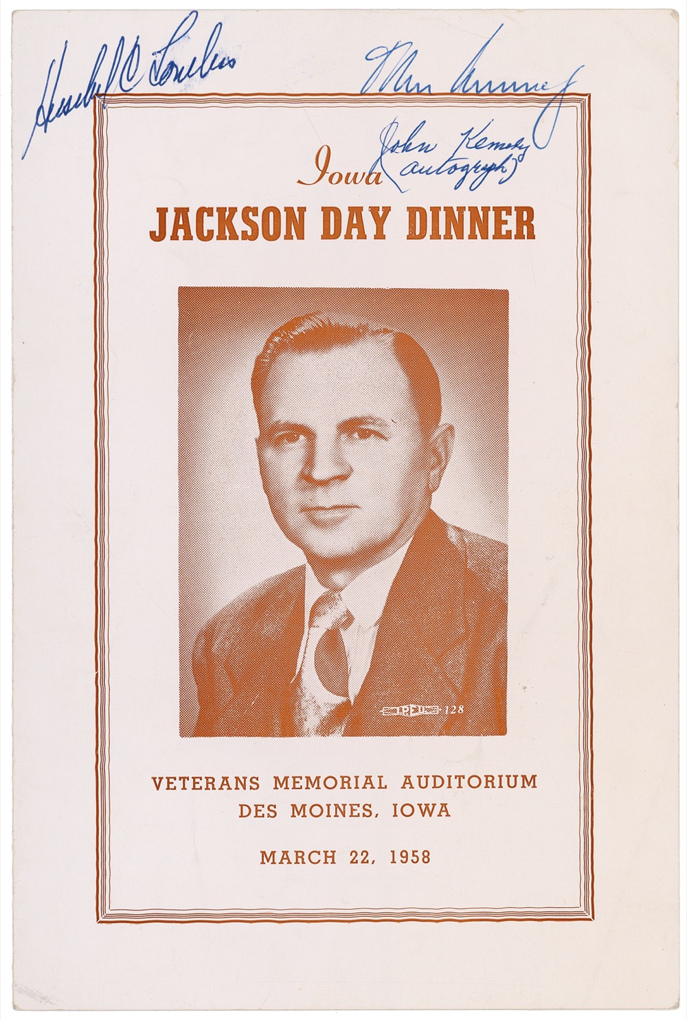 Vintage program/menu for the Iowa Jackson Day Dinner held on March 22, 1958, two pages, 6 x 9, signed on the front cover in blue ballpoint by Kennedy, and also signed by Iowa governor Herschel Loveless. Kennedy was the guest of honor and gave the address at this annual Democratic dinner predicting “the greatest Democratic year since 1936.” In fine condition, with scattered light creases and handling wear, and a collector’s notation under Kennedy’s signature. Pre-certified John Reznikoff/PSA/DNA and RRAuction COA.