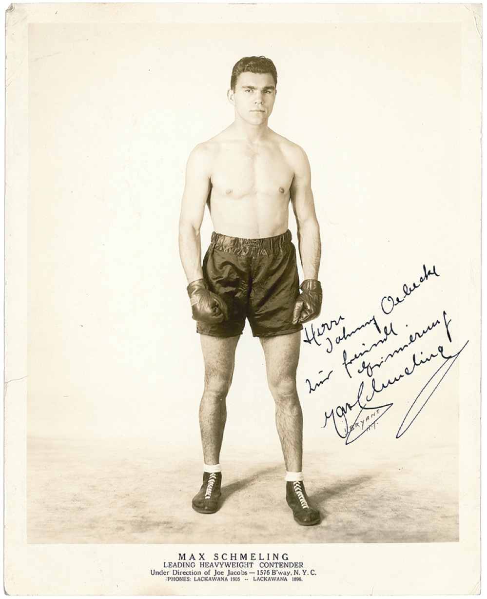 Vintage glossy 8 x 10 promotional photo of Schmeling as a “leading heavyweight contender,” signed and inscribed in fountain pen in German to Johnny Oebecke. Scattered light creasing, mostly to edges and corners, not affecting signature, otherwise fine condition. Pre-certified Steve Grad/PSA/DNA and RRAuction COA.