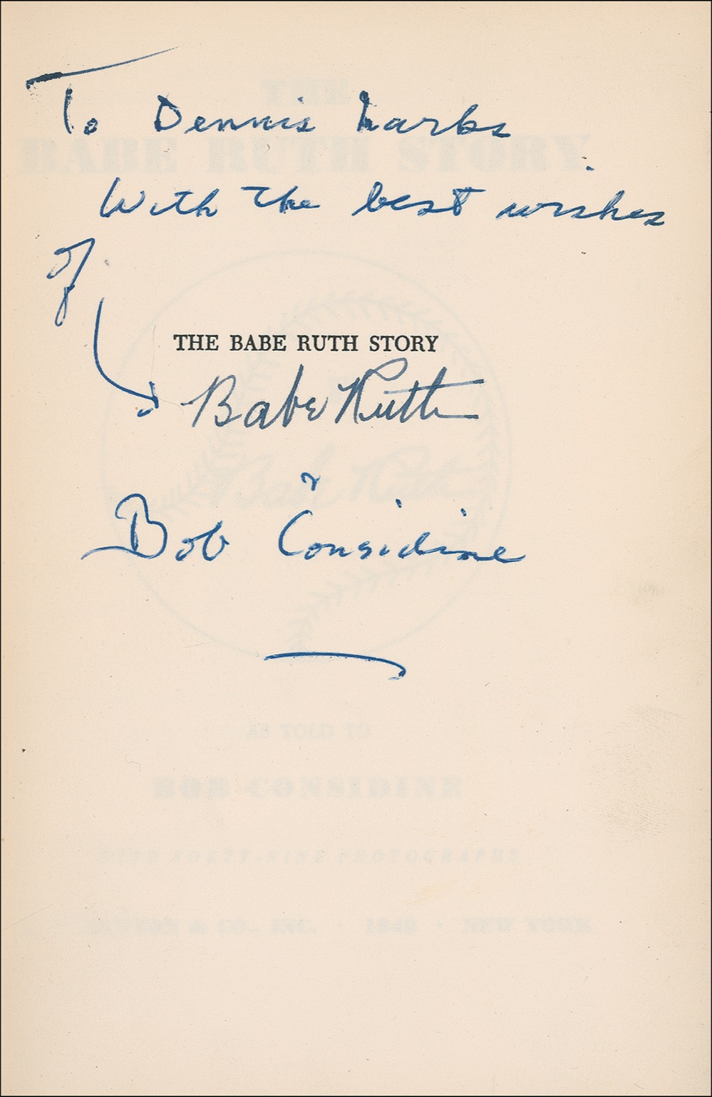 Signed book: The Babe Ruth Story. First edition. NY: E. P. Dutton & Co, 1948. Hardcover with dustjacket, 5.75 x 8.25, 250 pages. Signed in fountain pen on the half-title page, “Babe Ruth,” and signed and inscribed in blue ink around Ruth’s signature, “To Dennis Marks, With the best wishes of Bob Considine.” In fine condition, with creasing and repaired tears to dustjacket, light sunning and creasing to spine, and light rubbing and surface wear to back cover. Nicely presented signature from the absolute twilight of Ruth’s career, as he would pass away in August of 1948. Pre-certified Steve Grad/PSA/DNA and RRAuction COA.