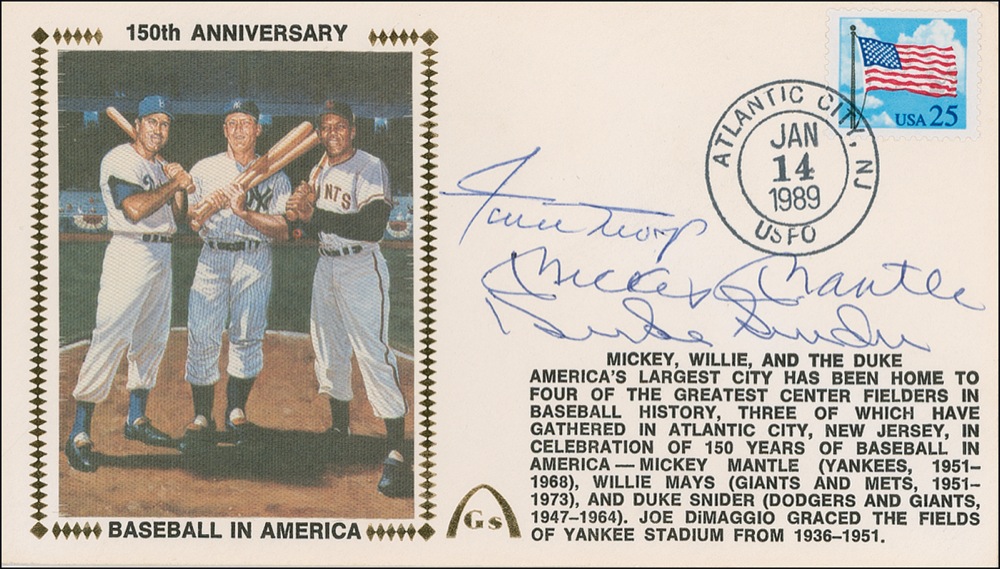Gateway commemorative cover with a color silk cachet honoring Mickey Mantle, Willie Mays, and Duke Snider, signed on the front in blue ballpoint by Mantle, Mays, and Snider. In very fine condition. Pre-certified Steve Grad/PSA/DNA and RRAuction COA.