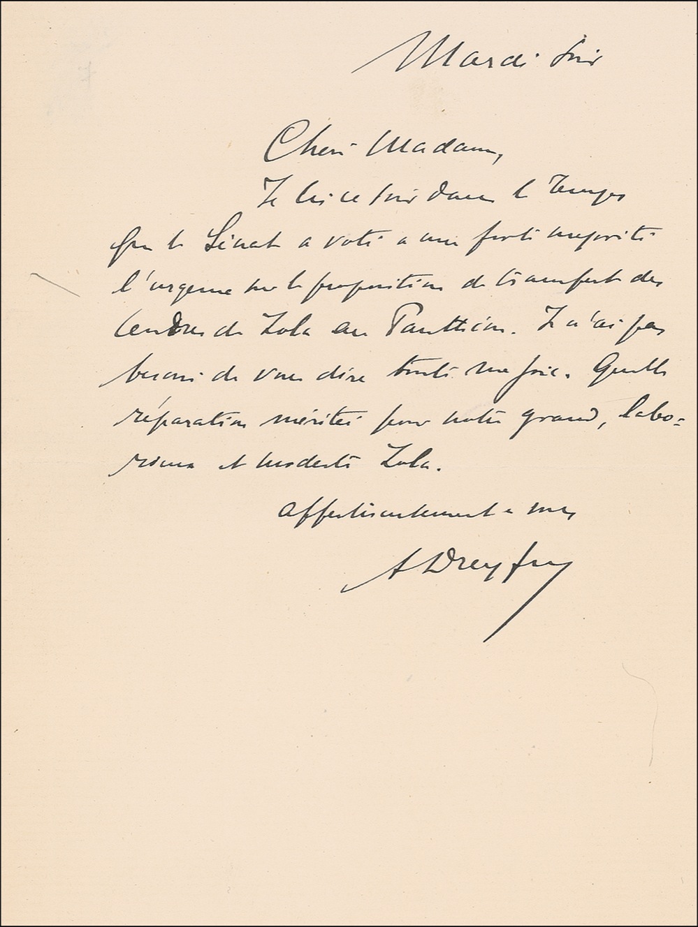 Writing to the widow of Emile Zola on his posthumous honor
