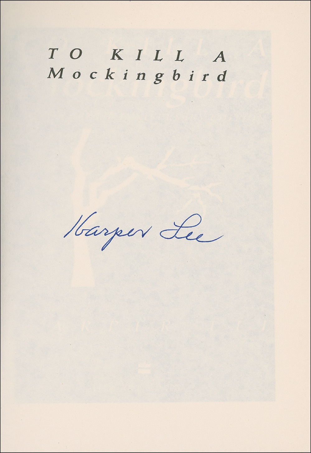 Signed book: To Kill a Mockingbird. Later printing of the 40th Anniversary Edition. NY: HarperCollins, 1999. Hardcover with dustjacket, 5.75 x 8.25, 323 pages. Signed in ballpoint on the half-title page. In very fine condition. As first editions of Mockingbird sell in the five figures, the still relatively uncommon signed examples of later editions represent the only opportunity for most collectors and fans to obtain a signed copy of this most beloved of American novels. RRAuction COA.