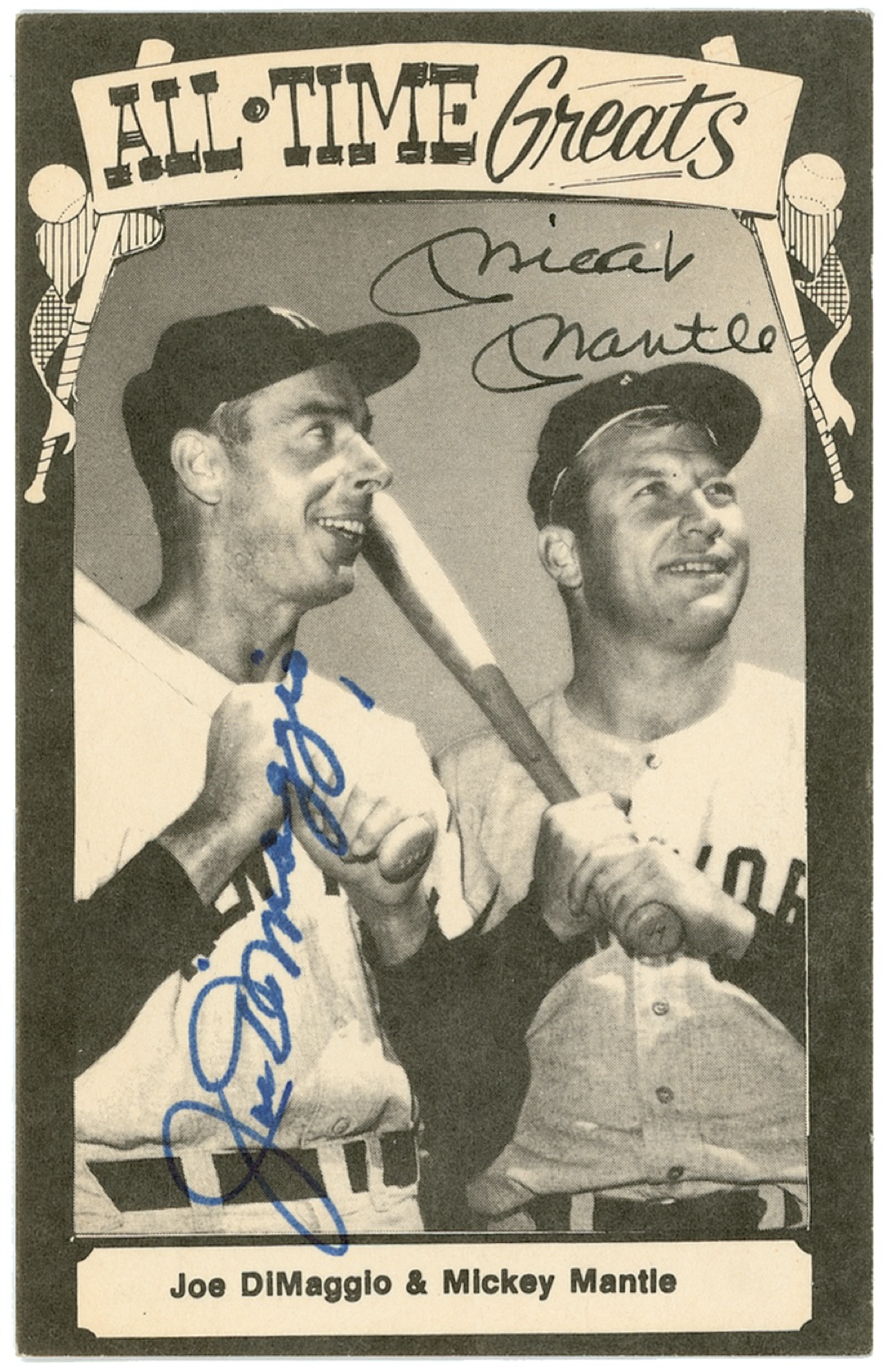 Original TCMA All Time Greats 3.5 x 5.5 postcard photo of Joe DiMaggio and Mickey Mantle posing together with their bats on their shoulders, signed in blue felt tip by DiMaggio and in black ink by Mantle. In very fine condition. Pre-certified Steve Grad/PSA/DNA and RRAuction COA.