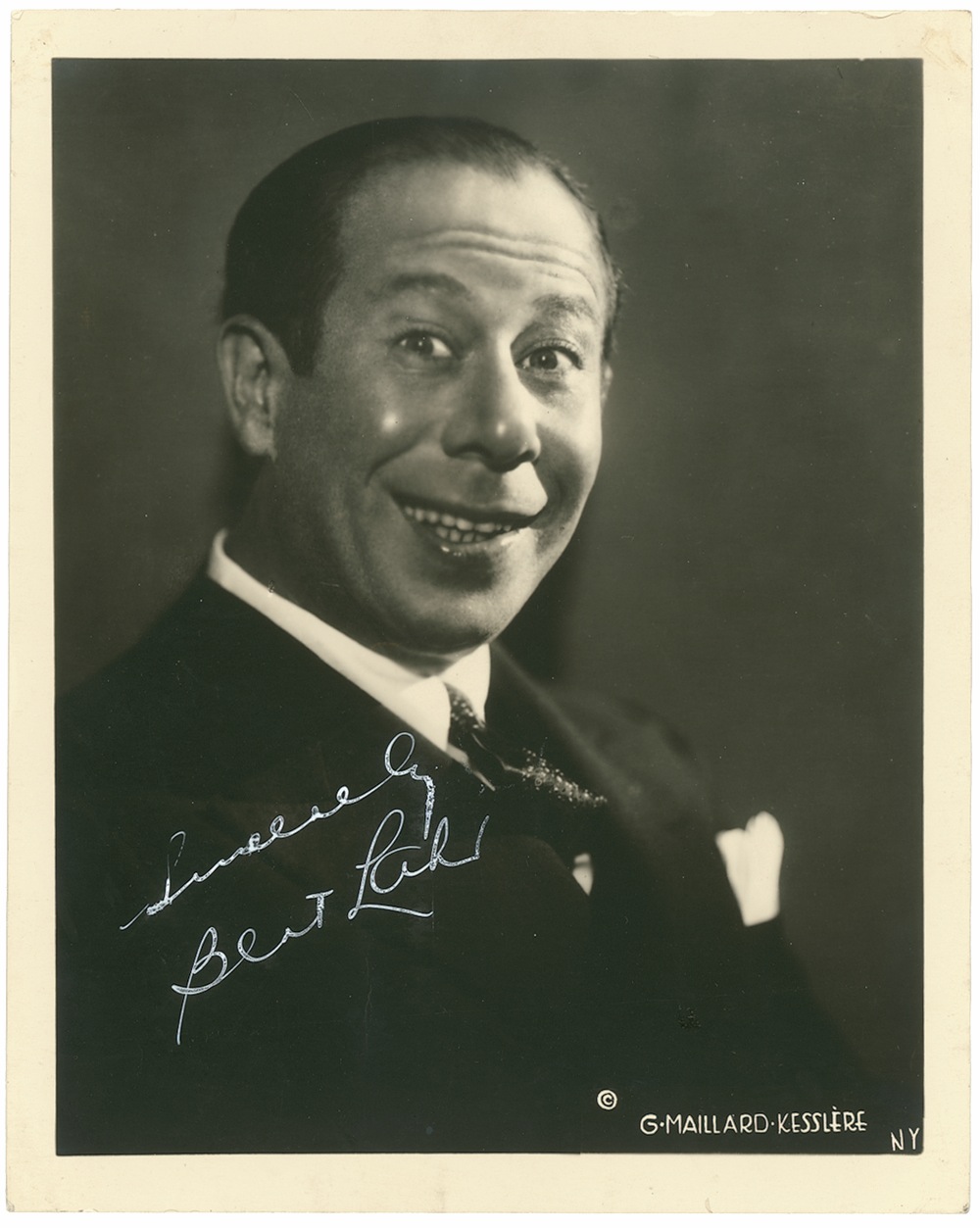 Vintage matte-finish 8 x 10 George Mallard Kesslere photo of a grinning Lahr, signed in white fountain pen, “Sincerely, Bert Lahr.” In fine condition, with a long horizontal crease, lightly touching a stroke of the ‘B’, light ink erosion to signature, and scattered light soiling and creasing. Accompanied by a letter of authenticity from PSA/DNA. RRAuction COA.