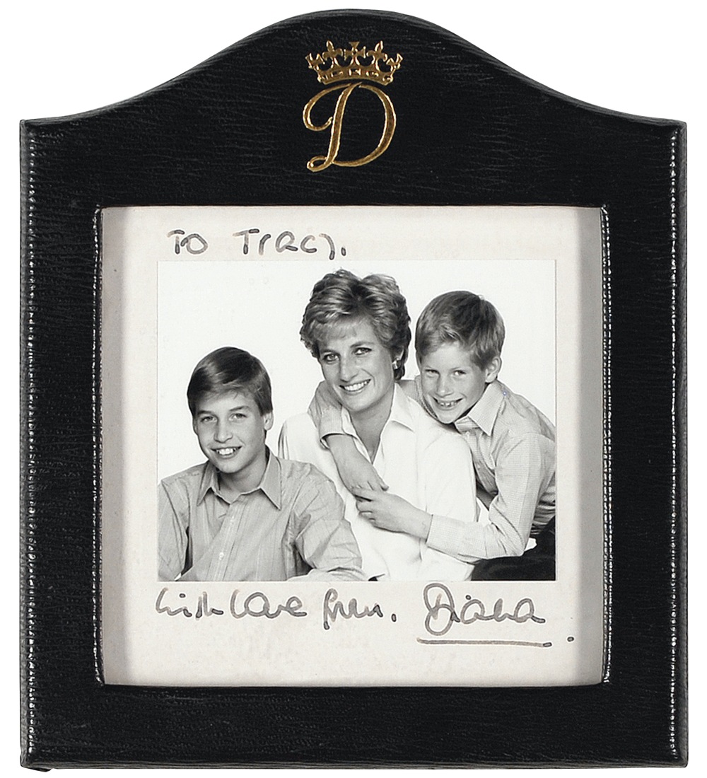 Satin-finish 4 x 3.25 photo of Diana and her two children, on a 5 x 5 heavy card mount, signed and inscribed in black ink on the mount, “To Tracy, With love from, Diana.” Photo is housed in its handsome original green leather frame with Diana’s crest and arched top measuring 6.75 x 7.75 overall. Accompanied by a 1995 TLS from Victoria Mendham in Diana’s office stating, “On Her Royal Highness’s instructions, I have much pleasure in forwarding the enclosed photograph for your daughter, Tracy.” Also accompanied by the original green Andrew Soos box, which is gilt-stamped on the front, “By appointment to His Royal Highness The Prince of Wales, Leather Goods Manufacturer, Andrew Soos, T/A Benedeck Limited London.” In fine condition. A beautifully presented photo, and the first we have come across with its original box. Pre-certified John Reznikoff/PSA/DNA and RRAuction COA.