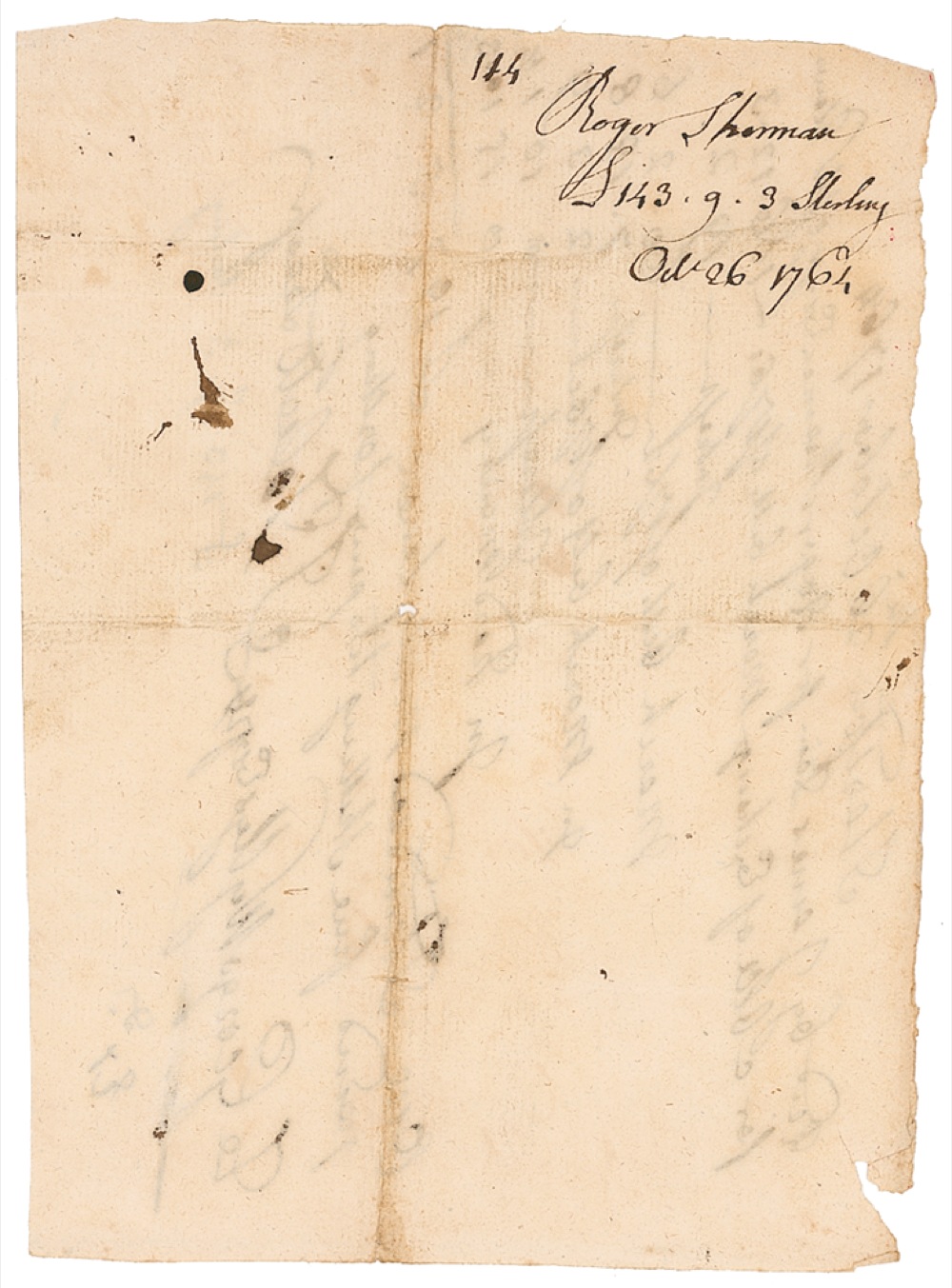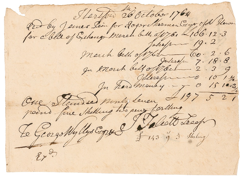 Signer of the Declaration of Independence from Connecticut (1721–1793) who was also the only man to also sign the Articles of Association, the Articles of Confederation, and the U.S. Constitution. Ink docketing signature, “Roger Sherman, £143.9.3 Sterling, Oct. 26, 1764,” on the reverse of a 5.5 x 8 financial document. In fine condition, with expected folds, one above date, scattered light toning and edge wear, and slight show-through from text on reverse. Pre-certified John Reznikoff/PSA/DNA and RRAuction COA.