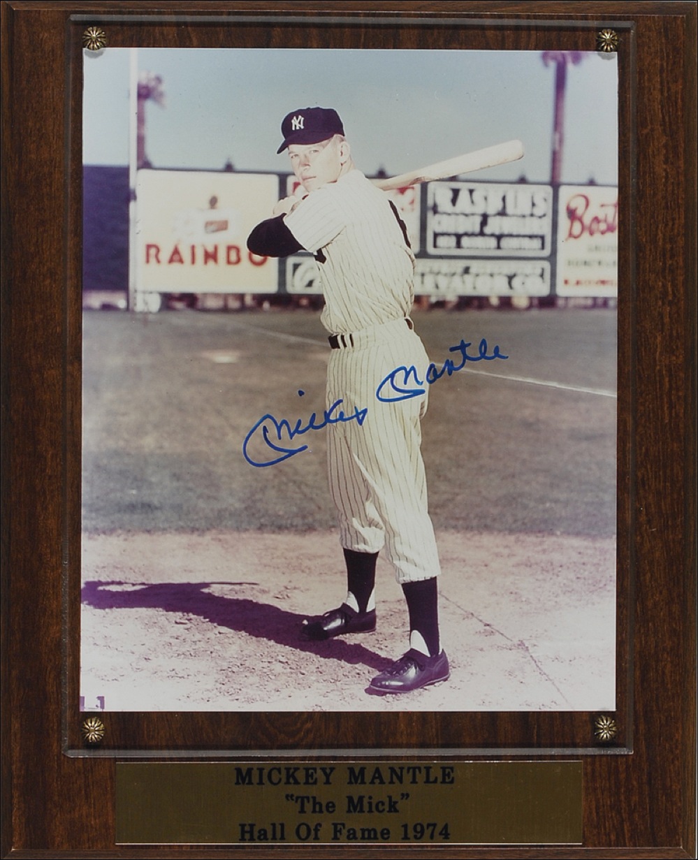 Color glossy 8 x 10 photo of Mantle in his Yankees uniform holding a bat, signed in blue felt tip. Displayed under Lucite affixed to a wooden plaque, to an overall size of 10 x 13. In fine condition. Pre-certified Steve Grad/PSA/DNA and RRAuction COA.