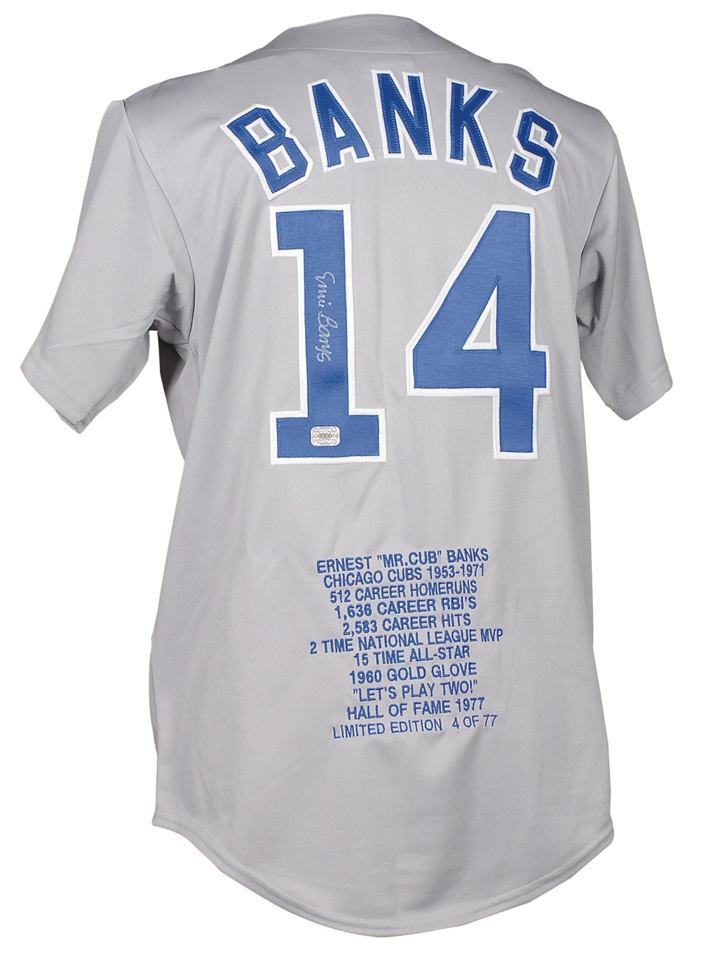 Official limited edition Majestic replica Chicago Cubs baseball jersey, #4/77, with sewn on letters and numbers, as well as Banks’s career statistics embroidered on the back, signed in silver ink on the number on the back. In very fine condition. Pre-certified Steve Grad/PSA/DNA and RRAuction COA.