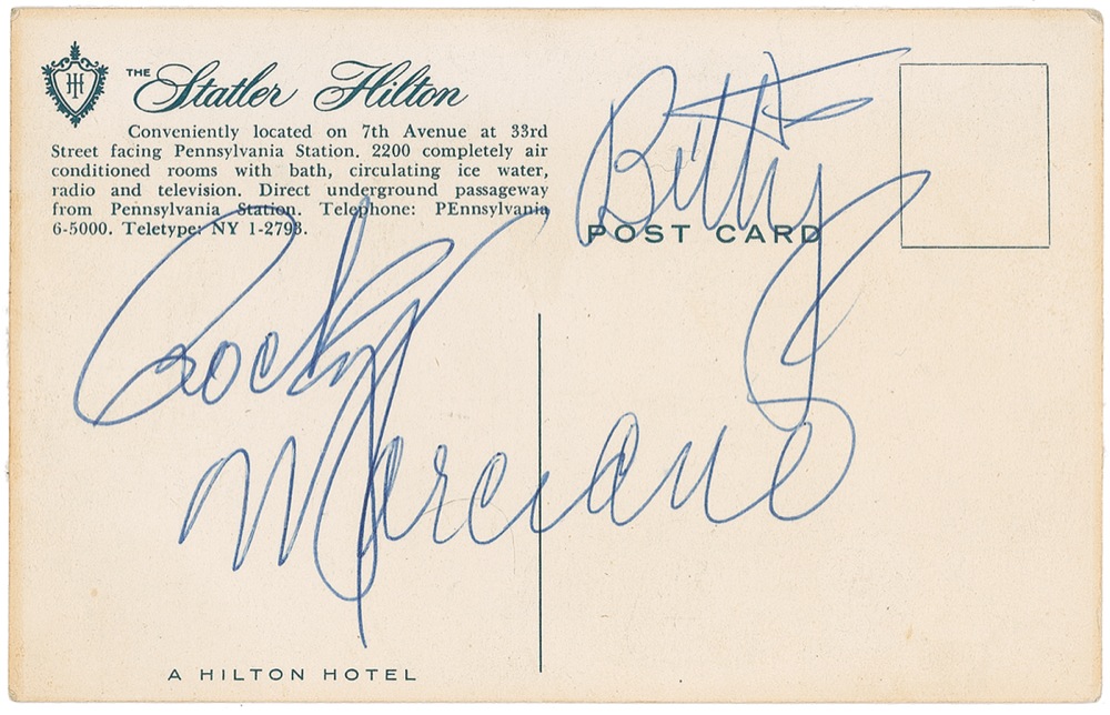 Ballpoint signature and inscription, “To Billy, Rocky Marciano,” on the correspondence side of a 5.5 x 3.5 postcard for the Statler Hilton in New York. In fine condition, with faint edge toning and mounting remnants to reverse. Pre-certified Steve Grad/PSA/DNA and RRAuction COA.