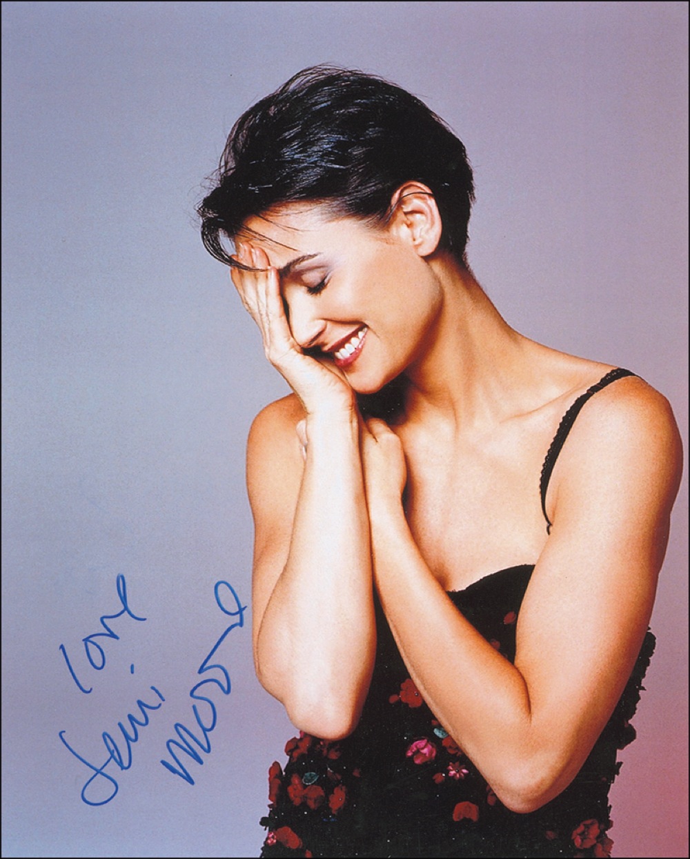 Sexy color satin-finish 11 x 14 photo of Moore laughing, signed in blue felt tip, “Love, Demi Moore.” In fine condition, with very faint traces of a removed inscription above the signature. RRAuction COA.