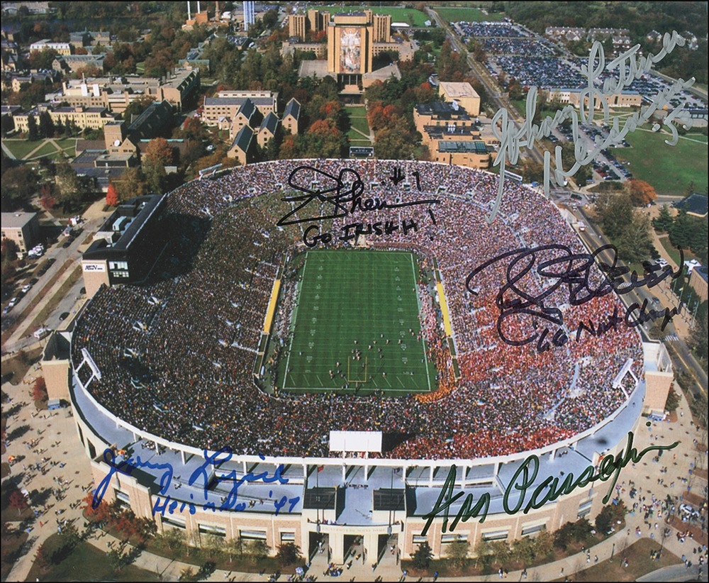 Color glossy 10 x 8 photo of Notre Dame’s stadium, signed in ink and felt tip by five: Johnny Lujack, Johnny Lattner, Ara Parseghian, Rocky Bleier, and Joe Theismann. In fine condition. Pre-certified Steve Grad/PSA/DNA and RRAuction COA.