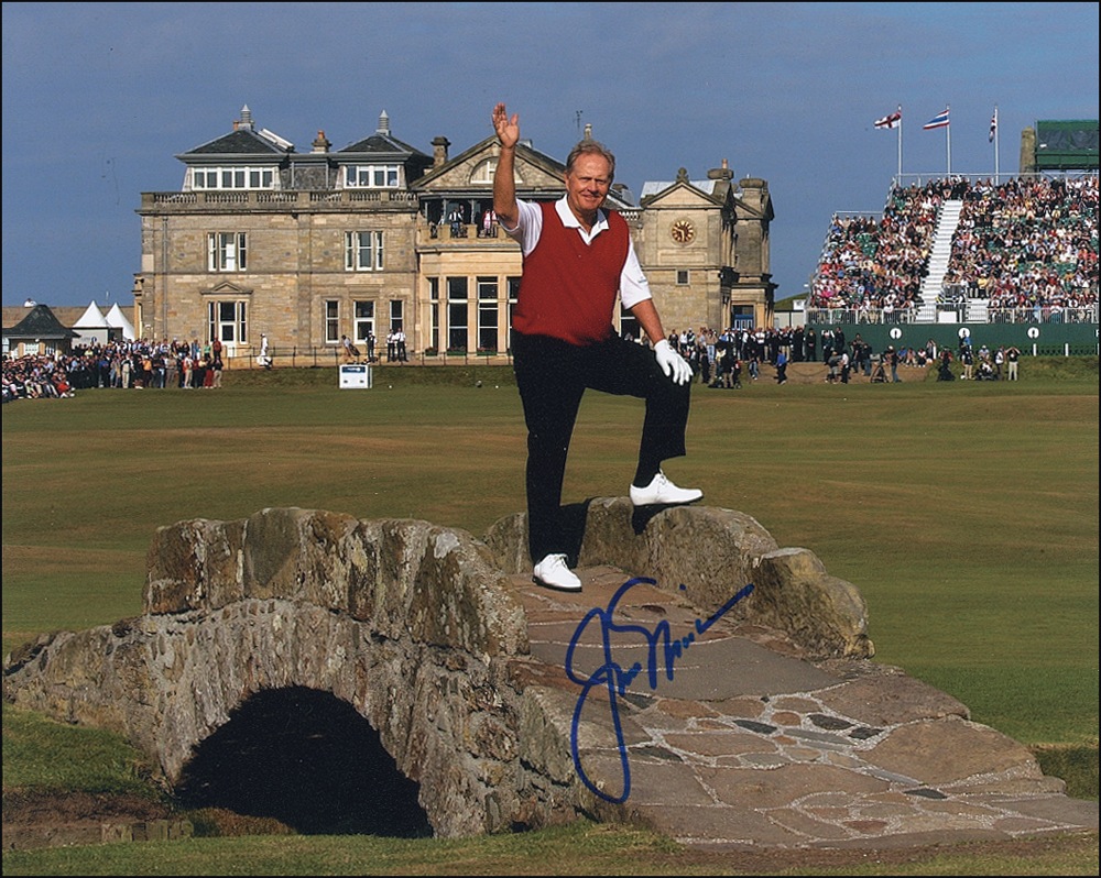 Color satin-finish 10 x 8 photo of Nicklaus on the course, signed in blue felt tip. In fine condition. Pre-certified Steve Grad/PSA/DNA and RRAuction COA.