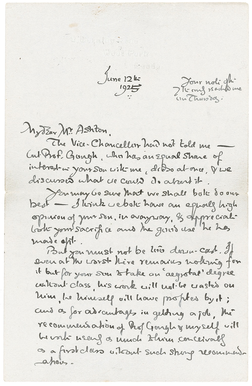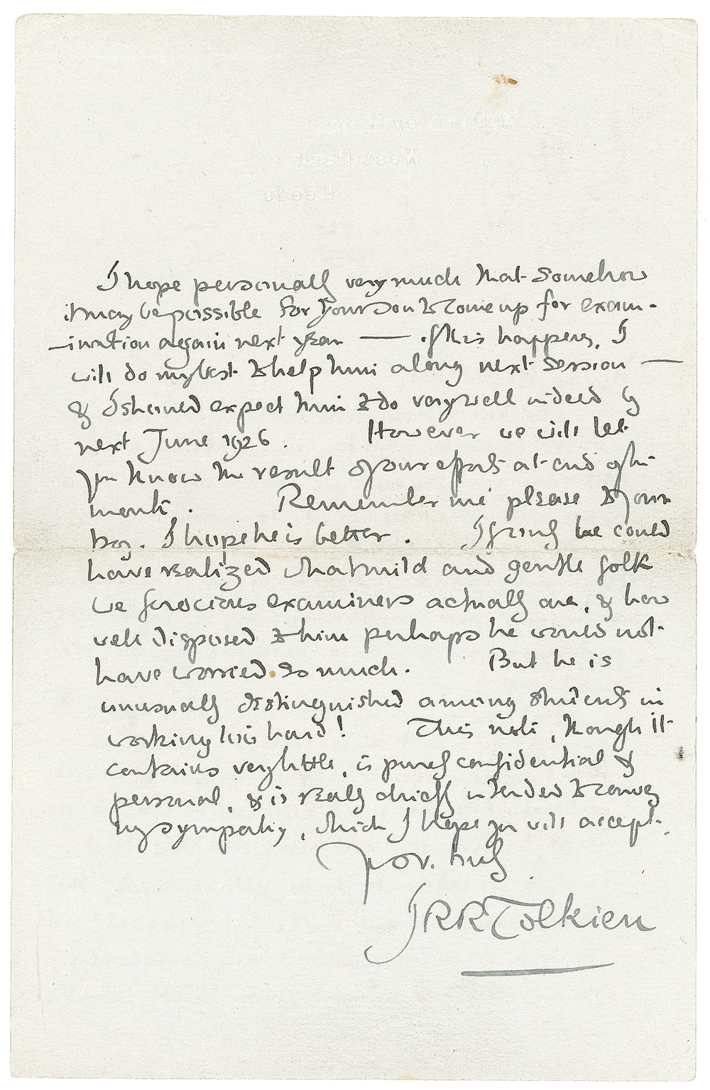 Early ALS, one page both sides, 4.5 x 7, blind-stamped personal letterhead, June 12, 1925. Tolkien, at the end of his five-year stint at Leeds University, and weeks before his appointment as a professor of Anglo-Saxon at Oxford, writes in his distinctive calligraphic hand to Mr. Ashton. In part: “The Vice-Chancellor had not told me—but Prof. Gough, who has an equal share of interest in your son like me, did so at once, & we discussed what we could do about it. You may be sure that we shall both do our best—I think we both have an equally high opinion of your son, in every way, & appreciate both your sacrifice and the good use he has made of it. But you must not be too downcast. If even at the worst there remains nothing for it but for your son to take an “aegrotat” degree [an honors degree conferred upon a student who, unable to take exams because of illness, would have by every expectation passed] without class, his work will not be wasted on him, he himself will have profited by it; and as for advantages in getting a job, the recommendation of Prof. Gough & myself will be worth using as much to him conceivably as a first class without such strong recommendations. I hope personally very much that somehow it may be possible for your son to come up for examination again next year. If this happens, I will do my best to help him along next session…. If only he could have realized what mild & gentle folk we ferocious examiners actually are, & how well disposed to him perhaps he would not have worried so much. But he is unusually distinguished among students in working too hard!…” Mild soiling and wrinkling, otherwise fine condition.