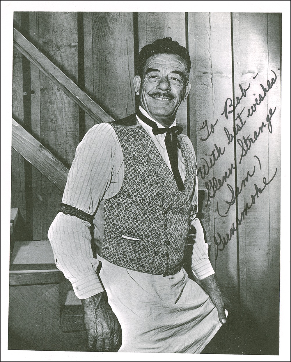 Actor (1899–1973) who, after appearing in a string of westerns, became better known as Frankenstein’s monster after Boris Karloff declined to continue in the role he had created. Strange played the character in three films, but later gained his greatest fame for his role as bartender Sam Noonan in the durable TV western Gunsmoke. Textured cardstock 8 x 10 photo of Strange as bartender Sam Noonan in Gunsmoke, signed and inscribed in black felt tip, “To Bob—with best wishes, Glenn Strange (Sam), Gunsmoke.” In fine condition, with light creasing to upper corners. Uncommon in any form. RRAuction COA.