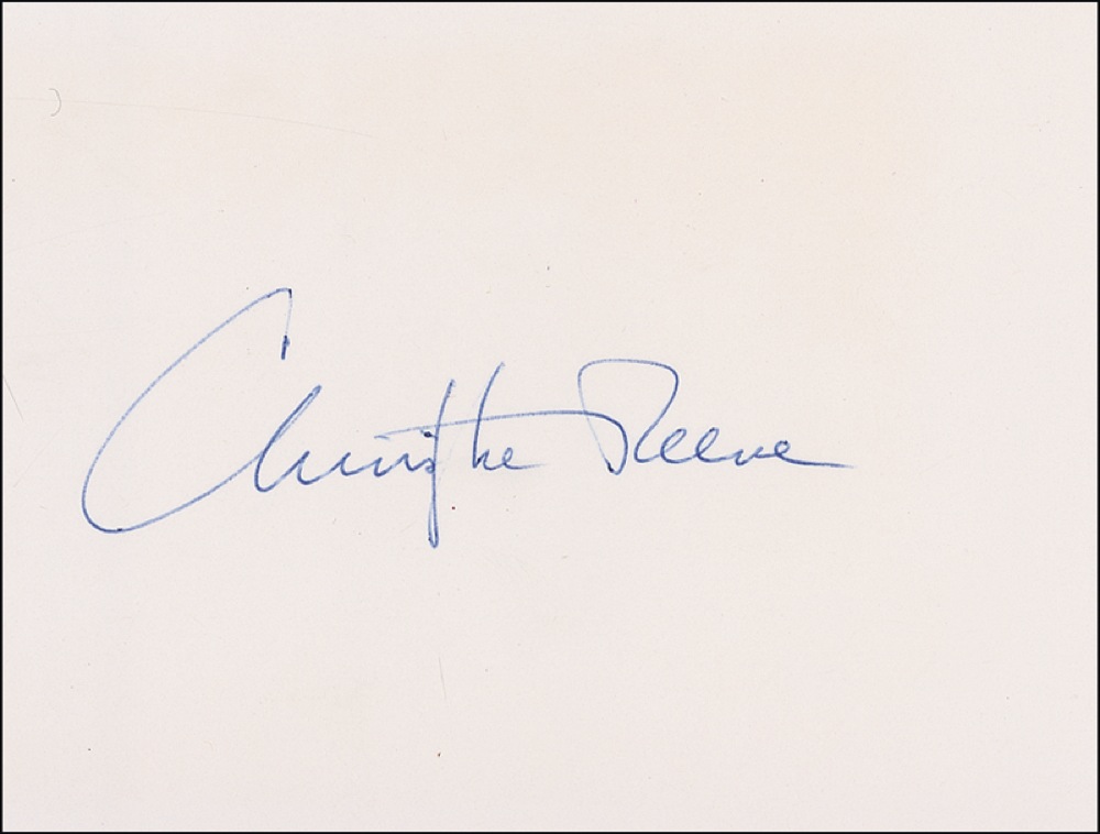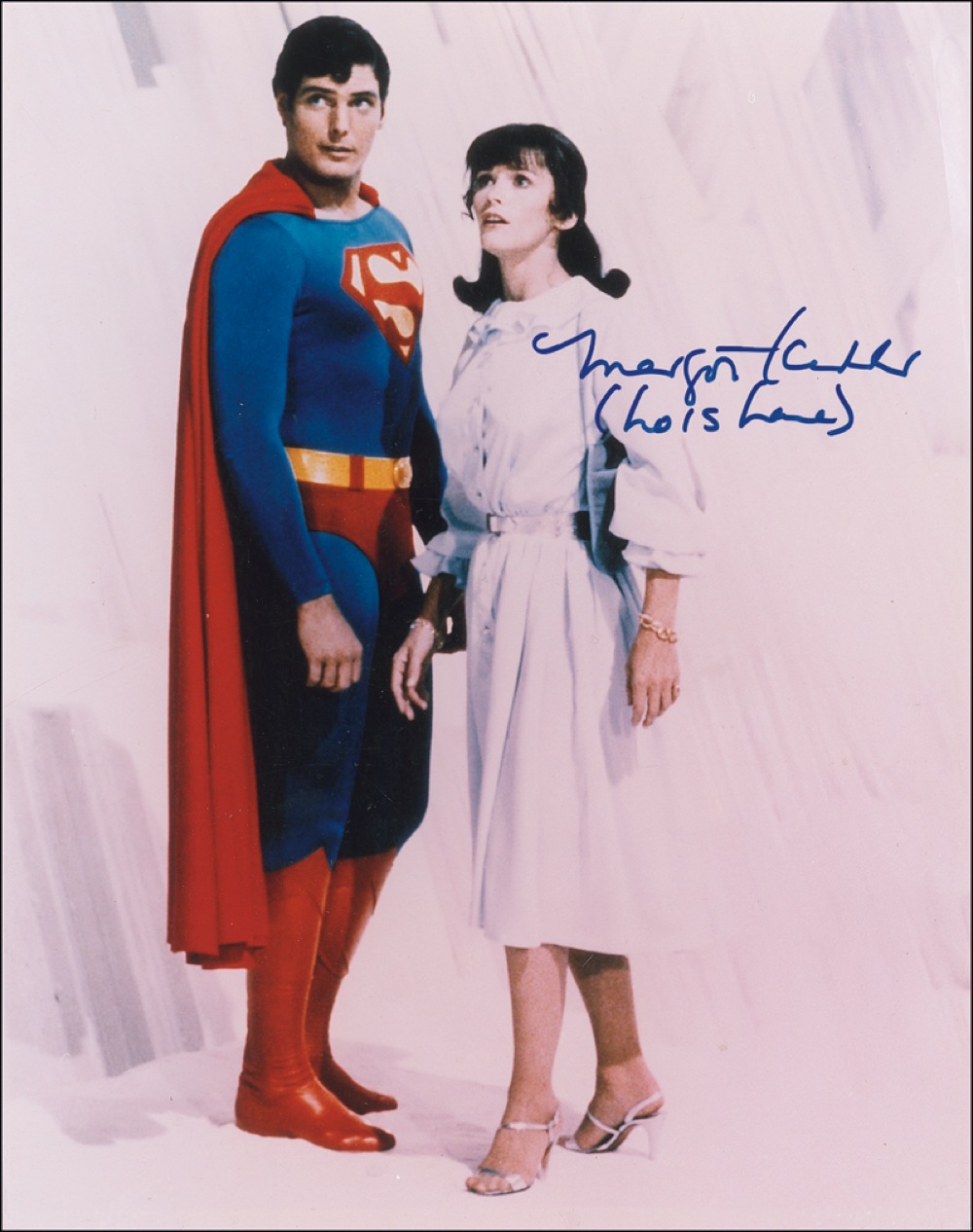 Two items: a 5 x 3.5 off-white card signed in blue ballpoint, “Christopher Reeve;” and a color glossy 11 x 14 full-length photo of Superman and Lois Lane in the Fortress of Solitude, signed in blue felt tip by Kidder (adding “Lois Lane”). In overall fine condition. RRAuction COA.