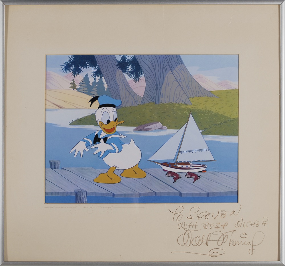 Color 11 x 8.5 print of Chip and Dale carrying a model sailboat down a dock under the watchful eye of Donald Duck from the 1956 animation short Chips Ahoy, matted to an overall size of 15.5 x 14.5, and signed and inscribed in black artists pencil on the mat, “To Stephen, with best wishes of Walt Disney.” Penned, in another hand, at mat edge beneath print, “Walt Disney’s Chips Ahoy,” at left. Framed to an overall size of 16.25 x 15.25. This print is apparently a replacement for a missing animation cel. In fine condition, with some mild toning to mat and a small vertical tear to top edge. Pre-certified PSA/DNA and RRAuction COA.