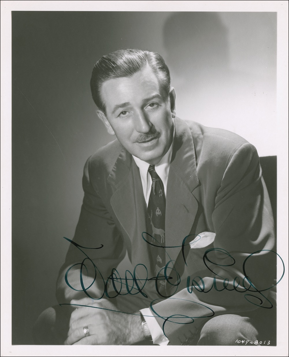 Exceptional vintage matte-finish 8 x 10 photo of Disney leaning forward in a chair, posing casually with his arms resting on his legs, circa late 1940s, signed in fountain pen. Accompanied by a certificate of authenticity from Phil Sears. In fine condition, with three very small border tack holes, a couple small creases to top right corner, and a couple other trivial creases, one through opening stroke of signature. A most pleasing example boasting a large, bold signature! Pre-certified PSA/DNA and RRAuction COA.