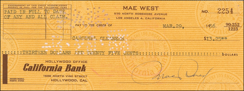 Personal check, 8 x 3, filled out in type and signed by West, payable to Carousel Cleaners for $13.25, March 29, 1956. In fine condition, with expected cancellation holes, and a bisecting vertical fold, with nothing affecting the clean signature area. RRAuction COA.