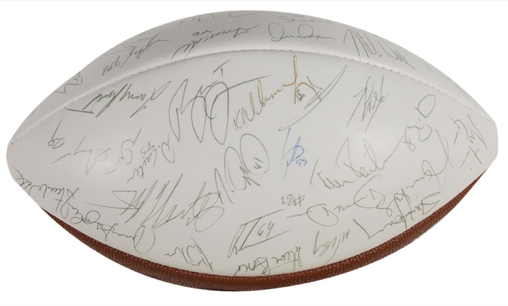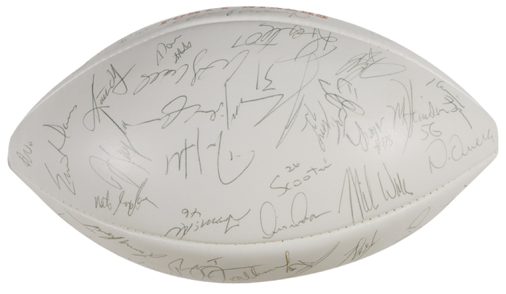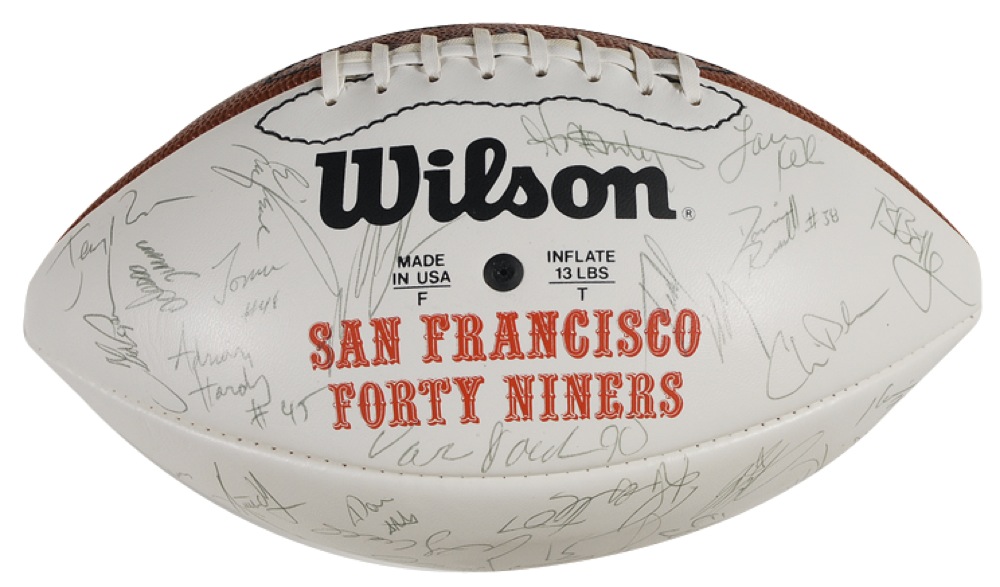 Official Wilson San Francisco 49ers commemorative football signed in ballpoint on the white side panels by 51 members of the 1993 49ers including: Jerry Rice, Steve Young, John Taylor, Ricky Watters, Steve Wallace, Harris Barton, Steve Bono, and Brent Jones. In fine condition. Pre-certified Steve Grad/PSA/DNA and RRAuction COA.