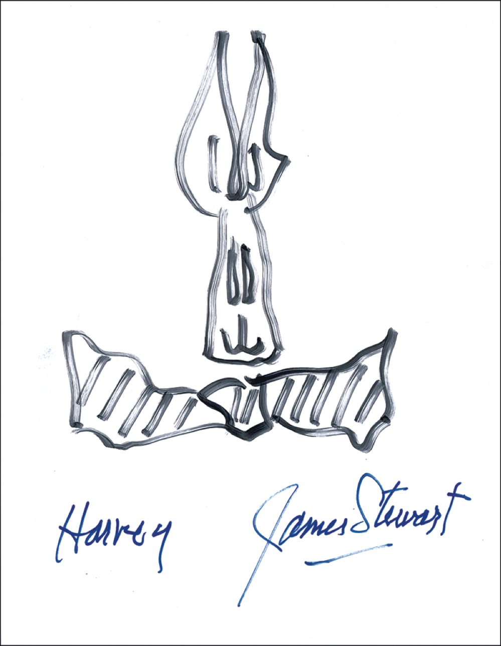Original signed felt tip sketch of Harvey the Rabbit on an off-white 8.5 x 11 card, signed at the bottom, “James Stewart” and “Harvey.” Accompanied by a letter of authenticity from PSA/DNA. In very fine condition. RRAuction COA.