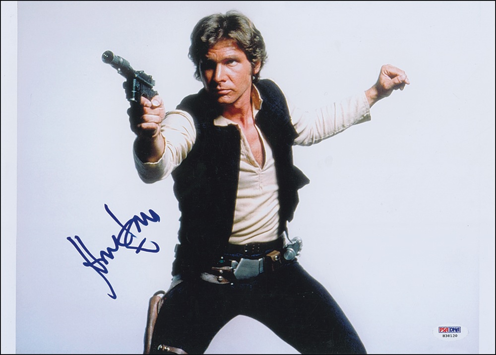 Uncommon color glossy 14 x 11 photo of Harrison as Han Solo, signed in blue felt tip. Accompanied by a certificate of authenticity from PSA/DNA. In very fine condition, with a PSA/DNA authentication label affixed to lower corner. RRAuction COA.
