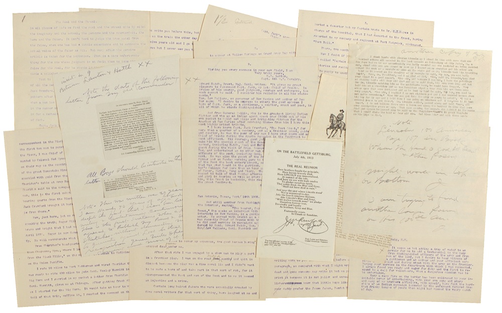 Western scout (1847–1917) during the Indian Wars who later enjoyed a career as a popular poet, playwright, short story author, and entertainer. Annotated typed manuscript consisting of 12 typed pages containing letters, observations and poems, annotated in several areas by Crawford. Apparently this was a work in progress on Crawford’s life and literary works. Crawford writes at the bottom of one page below a clipped 1887 passage, “Note—This was written over 29 years ago. I am nearly 70 years of age now and despite the fact that I have been lecturing, writing, & entertaining continuously. Since this is the first instance where a publisher agrees to publish my poems and short sketches without demanding money to guarantee against loss.” In very good overall condition. RRAuction COA.