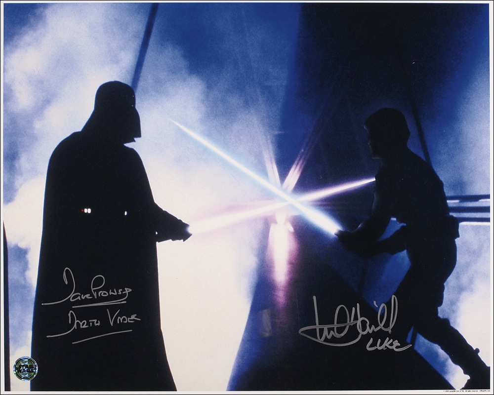 Color satin-finish 20 x 16 photo of Luke battling Darth Vader in The Empire Strikes Back, signed in silver ink by both David Prowse and Mark Hamill, each adding their character names underneath. In very fine condition. RRAuction COA.