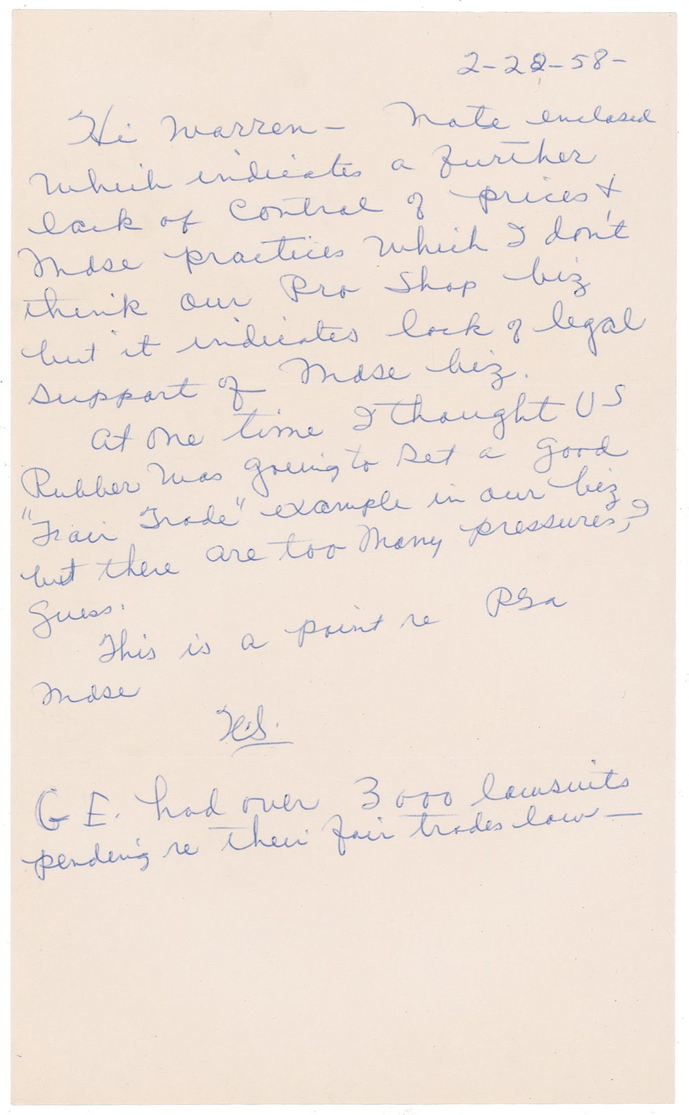 Early “boy wonder” of golf (1908–1963) who, at the age of twenty-one, played on the 1929 PGA tour and won eight of twenty-two events, as well as finishing second six times. He was also the winner of the first (1934) Masters Tournament, and won again in 1936. ALS signed “H. S.,” one page, 6 x 9.75, February 22, 1958. Letter to future PGA President Warren Orlick. In part: “Note enclosed which indicates a further lack of control of prices & those practices which I don’t think our Pro Shop biz but it indicates lack of legal support of Mdse biz. At one time I thought U.S. Rubber was going to set a good ‘Fair Trade’ example in our biz but there are too many pressures I guess.” In fine condition. Pre-certified Steve Grad/PSA/DNA and RRAuction COA.