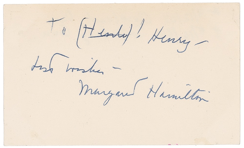 Ballpoint signature and inscription, “To (Harold)! Henry—Best wishes, Margaret Hamilton,” on an off-white 4 x 2.25 slip. In fine condition. RRAuction COA.