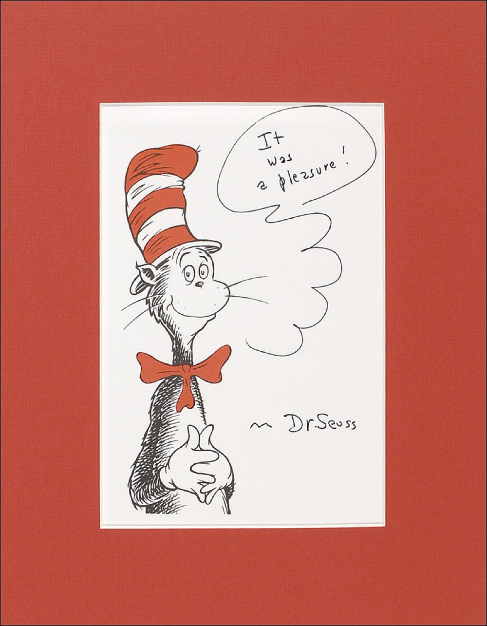 Color printed sketch of the Cat in the Hat on a white 5.25 x 7.75 sheet, signed in black felt tip adding a word balloon, “It was a pleasure!” Matted to an overall size of 9.25 x 12. In fine condition, with a light crease near top running through the speech balloon. RRAuction COA.