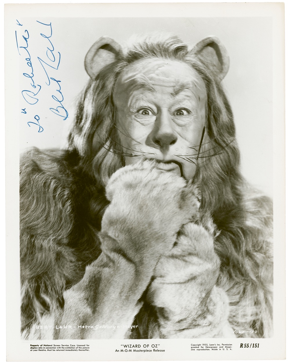 American comic actor. Fittingly born a Leo in New York City, he is best remembered today for his role as the Cowardly Lion (and the farmworker Zeke) in the classic 1939 movie The Wizard of Oz, but known during his life for a career in burlesque, vaudeville, and Broadway. He later remarked, “After ‘The Wizard of Oz’ I was typecast as a lion, and there aren’t all that many parts for lions.” Spectacular and extremely rare and desirable vintage glossy 8 x 10 MGM Wizard of Oz promotional close-up photo of Lahr as the Cowardly Lion, signed and inscribed vertically in fountain pen “To ‘Roberta’ Bert Lahr.” Just a few scattered faint surface marks and a couple trivial top edge dings, otherwise very fine condition. Signed photos of Lahr as the Cowardly Lion are virtually nonexistent! Most of the handful of known examples were signed in ballpoint in the 1960s and sent out after Lahr’s passing. This one, signed earlier and in fountain pen, is the true definition of vintage, setting it a cut above the rest. Pre-certified PSA/DNA and RRAuction COA.