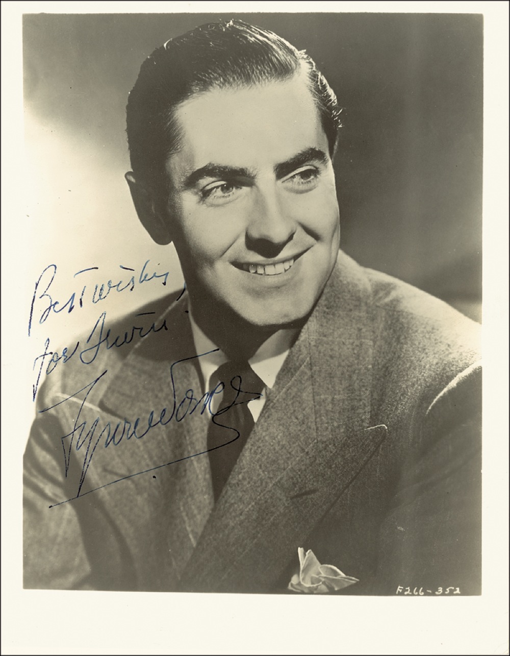 Handsome vintage glossy 8 x 10 photo, signed and inscribed in fountain pen “Best wishes for Louis, Tyrone Power.” In very good condition, with scattered creases and surface marks, with creasing heavier to lower border, and a bit of light ink adhesion to a couple strokes of signature and inscription. RRAuction COA.