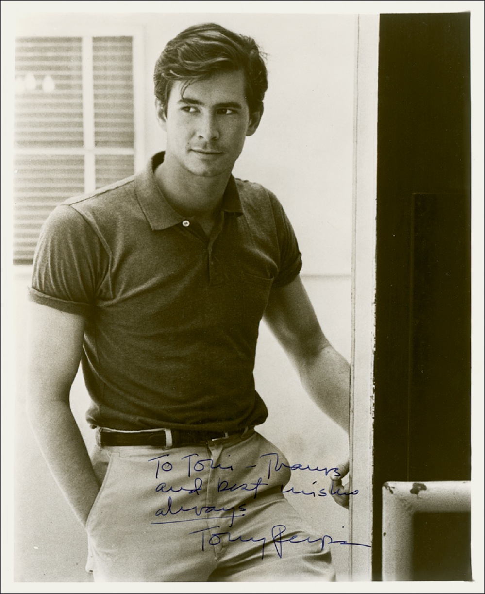 Vintage glossy 8 x 10 photo of the dashing young actor posing outdoors, signed and inscribed in fountain pen “To Tori—Thanks and best wishes always, Tony Perkins.” A couple dings to left edge, and some scattered light surface marks, otherwise fine condition. RRAuction COA.