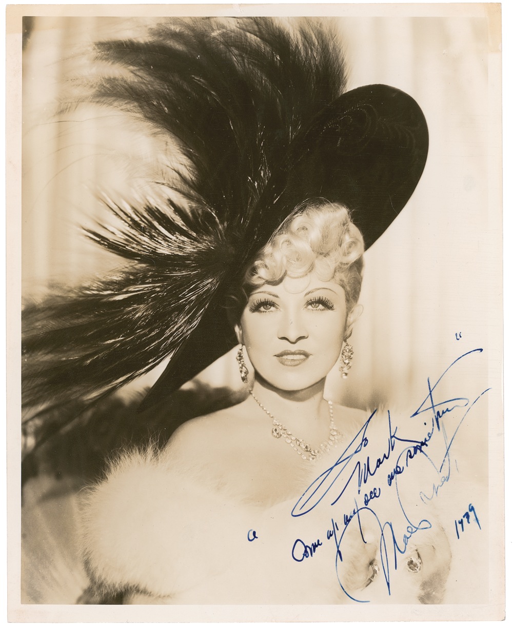 Vintage glossy 8 x 10 photo of a bejeweled West in an ostentatious feather hat, signed and inscribed in fountain pen, “To Mark, ‘Come up and see me sometime,’ Mae West, 1939.” In fine condition, with scattered cracking to the emulsion (visible primarily at an angle) and last name a shade light. RRAuction COA.