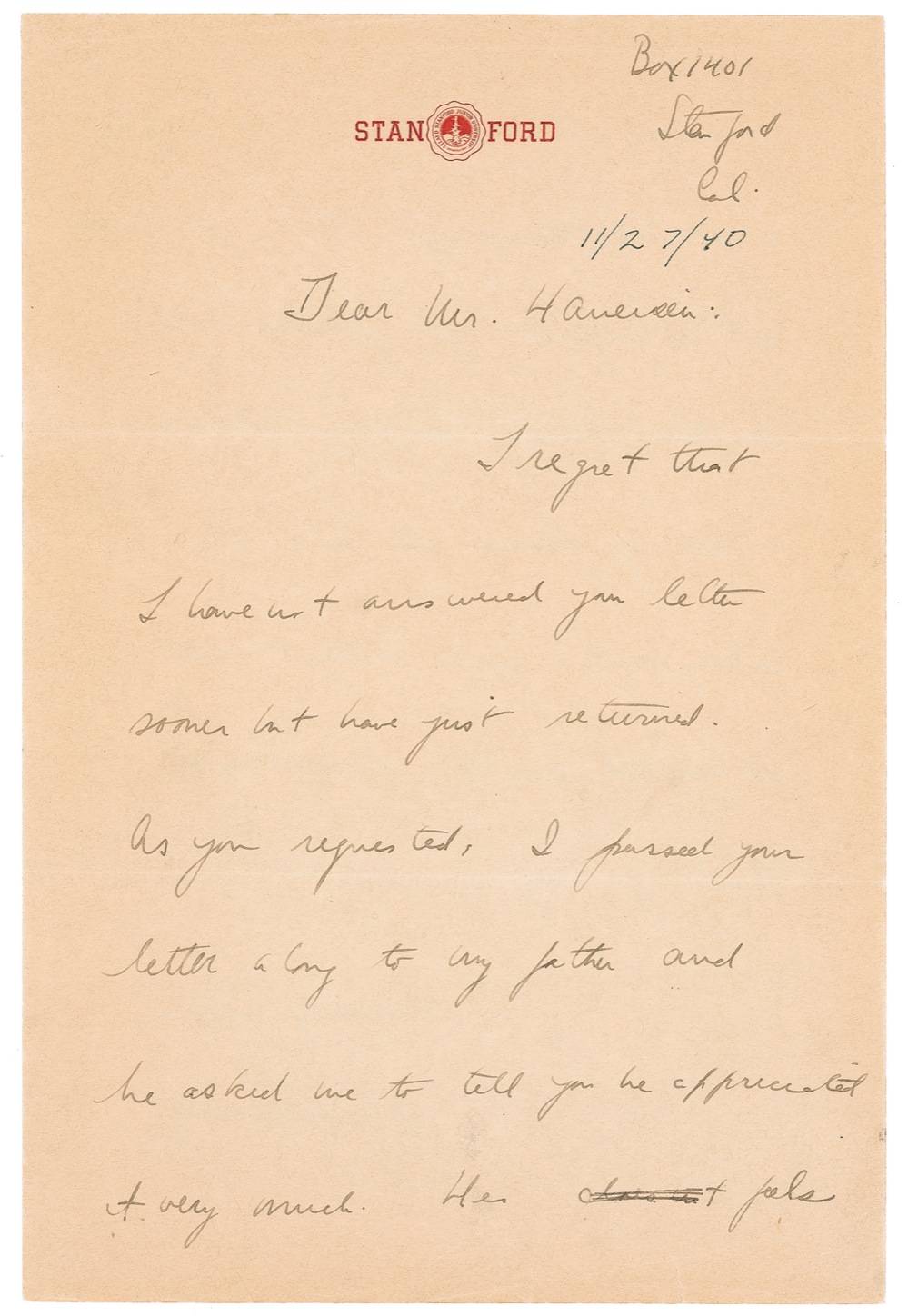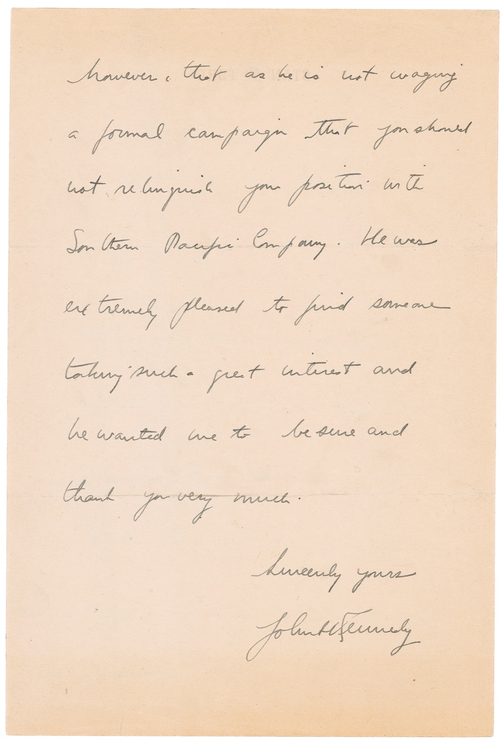 Very early and extremely legible ALS, one page both sides, 7 x 10.5, Stanford letterhead, November 27, 1940. Letter to Mr. Haueisen, sending thanks on behalf of his father. In full: “I regret that I have not answered your letter sooner but have just returned. As you requested, I passed your letter along to my father and he asked me to tell you he appreciated it very much. He feels however, that as he is not waging a formal campaign that you should not relinquish your position with Southern Pacific Company. He was extremely pleased to find someone taking such great interest and he wanted me to be sure and thank you very much.” Nicely signed in full at the conclusion, “John F. Kennedy.”