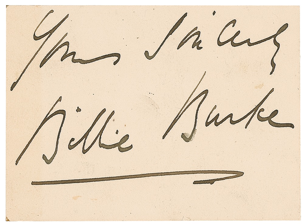 Vintage fountain pen signature, “Yours sincerely, Billie Burke,” on an off-white 2.75 x 2 slip. In fine condition, with previous mounting remnants affixed to the reverse and scattered light toning. RRAuction COA.