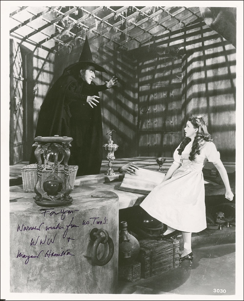Glossy 8 x 10 photo of the Wicked Witch frightening Dorothy, signed in black felt tip, “For you, Warm wishes from us two! WWW and Margaret Hamilton.” In fine condition, with bend to lower right corner and scattered light creasing. RRAuction COA.
