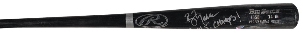 Game-used official Rawlings Big Stick professional model baseball bat signed in silver ink on the barrel, “B. Mueller, 04 W. S. Champs!” With damp staining to the barrel, otherwise fine condition. Pre-certified Steve Grad/PSA/DNA and RRAuction COA.