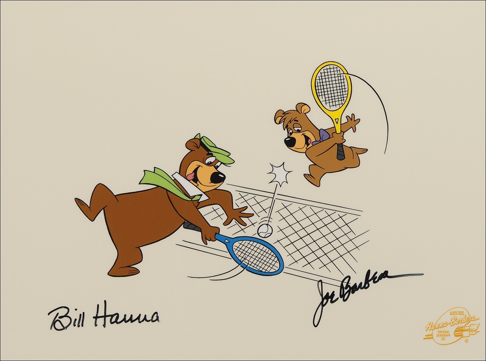 Color 12.5 x 9.5 serigraph entitled The Jellystone Open, showing Yogi and Boo Boo engaged in a tennis match, signed in black felt tip by Bill Hanna and Joe Barbera. Matted to an overall size of 20 x 16. In very fine condition. RRAuction COA.