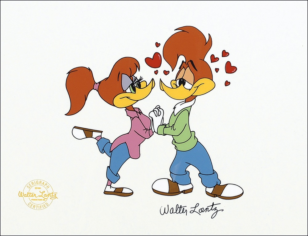 Color 11 x 8.25 serigraph entitled Lovebirds, showing an enchanted Woody Woodpecker falling for a female at a sock hop, signed in black felt tip by Lantz. Matted to an overall size of 20 x 16. In very fine condition. RRAuction COA.
