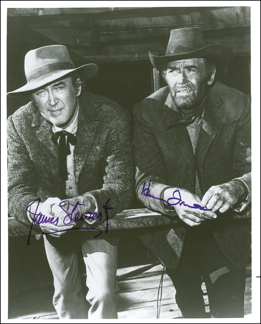 Glossy 8 x 10 photo of James Stewart and Henry Fonda, most likely from the film Firecreek, signed in purple felt tip by both James Stewart and Henry Fonda. In very fine condition. Pre-certified PSA/DNA and RRAuction COA.