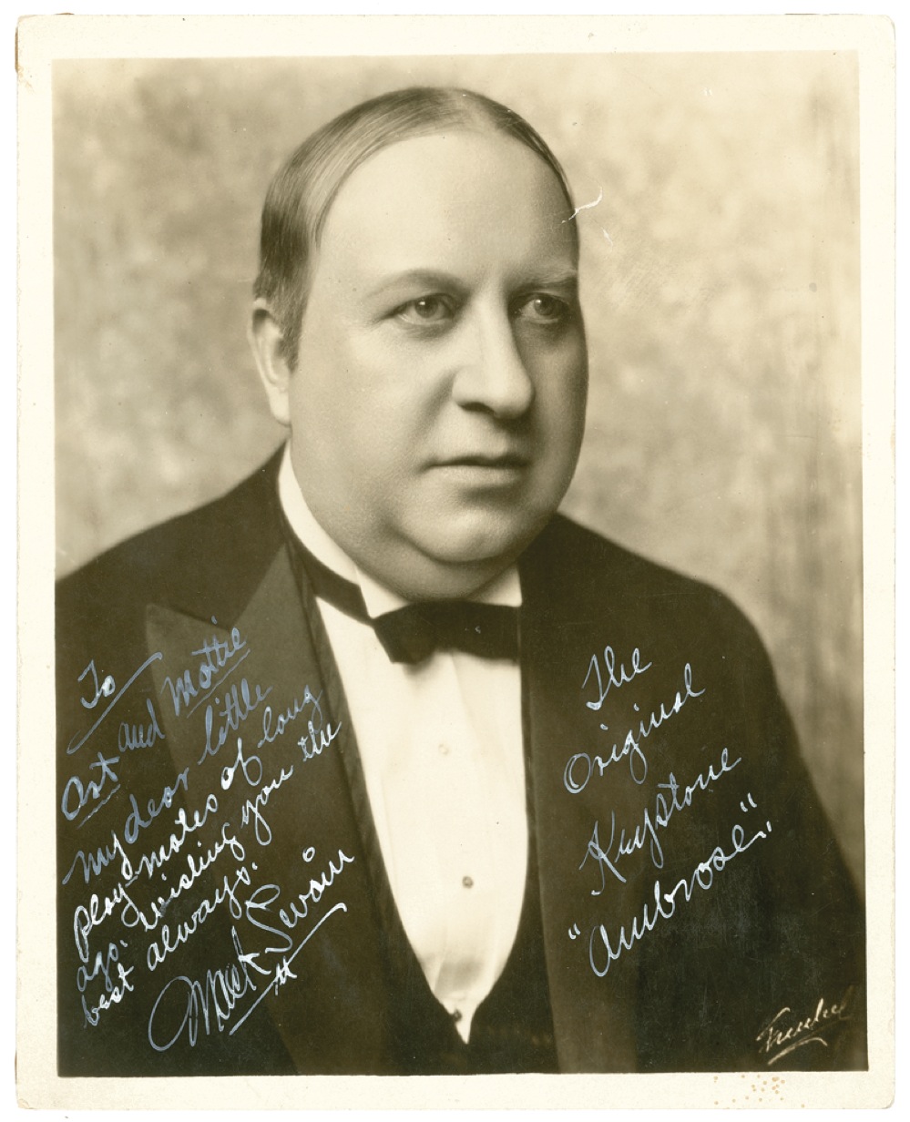 American actor and vaudevillian (1876-1935). Rare glossy 8 x 10 photo of Swain in a tuxedo, signed and inscribed in white fountain pen, “To Art and Mattie, my dear little play-mates of long ago, wishing you the best always, Mack Swain, the original Keystone ‘Ambrose.’” In very good condition, with tear to upper portion lightly affecting the face, diagonal bend, and scattered light creasing and impressions. Pre-certified PSA/DNA and RRAuction COA.